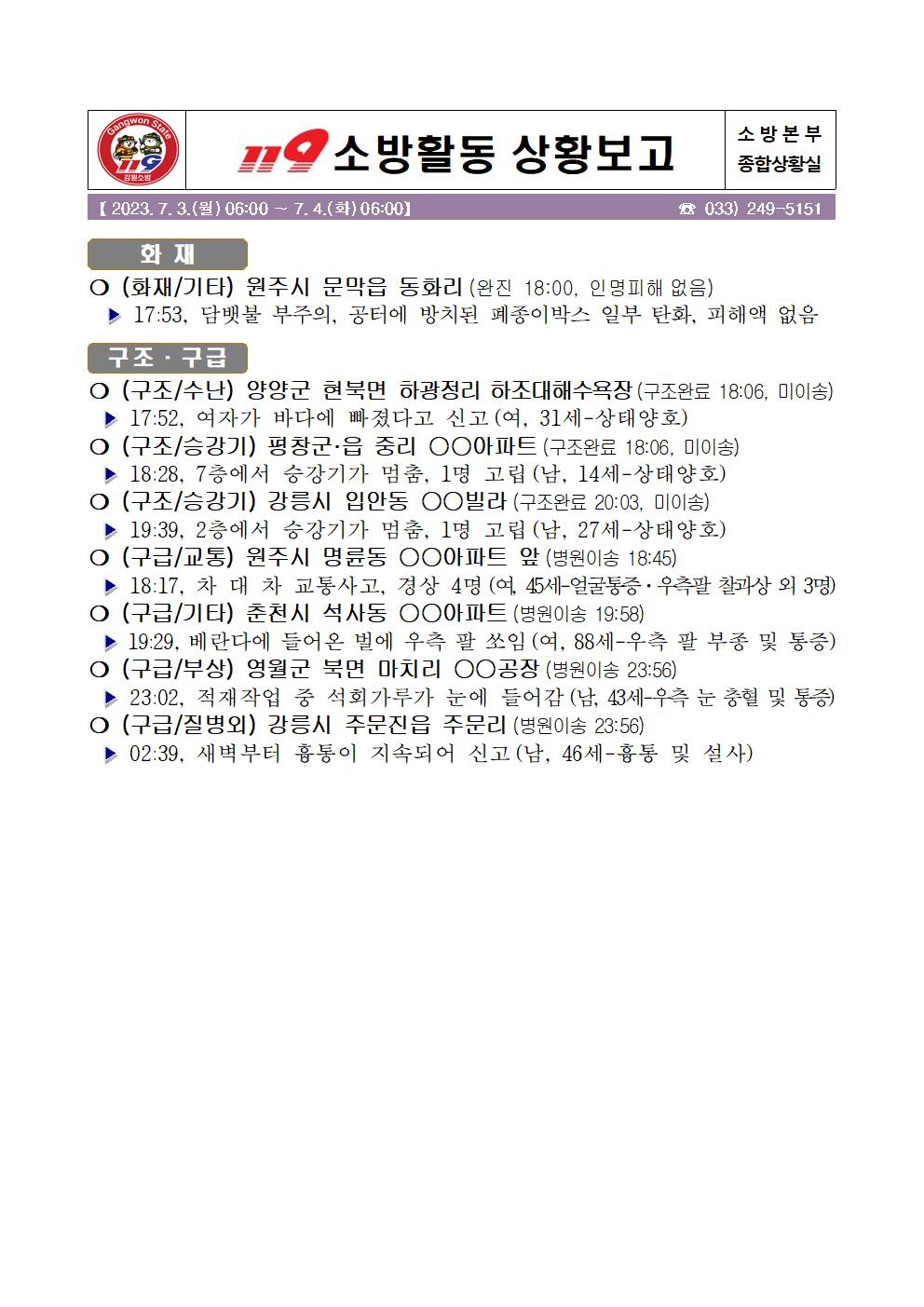 119 소방활동 일일상황보고(7.4.화) 06:00