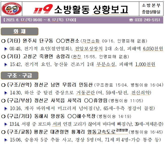 119 소방활동 일일상황보고(8.17.목) 17:00