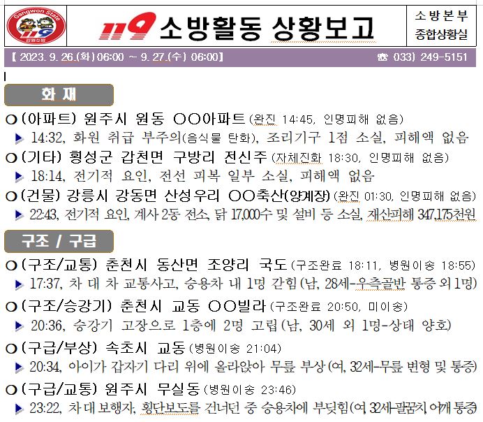 119 소방활동 상황보고(9. 27. 수) 06:00