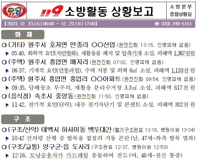 119 소방활동 일일상황보고(12.23.토) 17:00