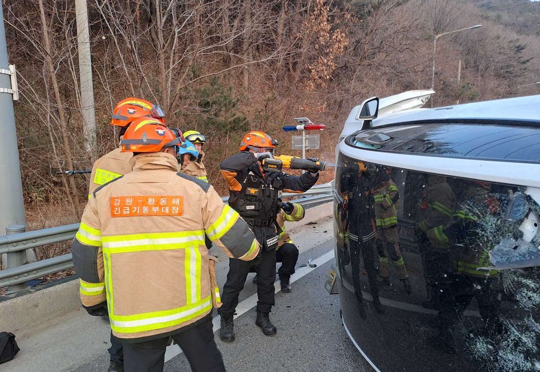 피해: 심정지 1명(조수석, 여,31세/강릉), 경상 1명(운전자, 목 통증, 남,40세/강릉)