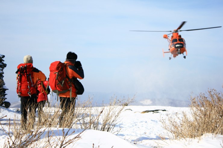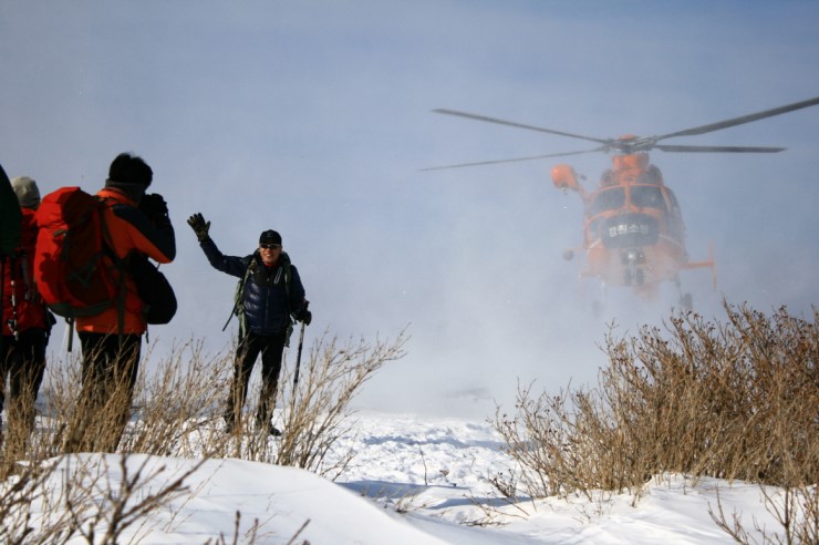 지난 1. 29 13:21경 정선군 북평면 숙암리 가리왕산, 정상으로 등반하던 탈진(고혈압 환자) 요구조자 - 1명 소방헬기(2호기) 이용 구조 사진입니다. 다른카페 검색하던중 "강원소방" 헬기가 눈에 띄어,,,담아왔습니다. 소방항공대 대원분들 팟팅입니다...^**