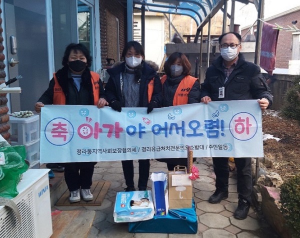 삼척소방서 정라 응급처치전문대(대장 진소영)는 지난 7일 정라동 한 가구의 신생아 출산기념으로 분유, 아기 옷 등 작은 선물을 전달했다고 전했다.
