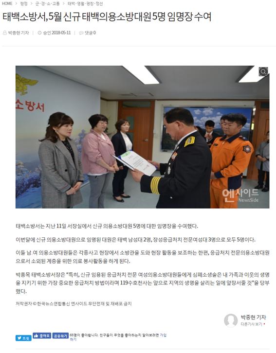 | 22699 | (태백)5월 신규 의용소방대원 임용장 수여 | 태백홍보 | 2018-05-14 | 267 | |