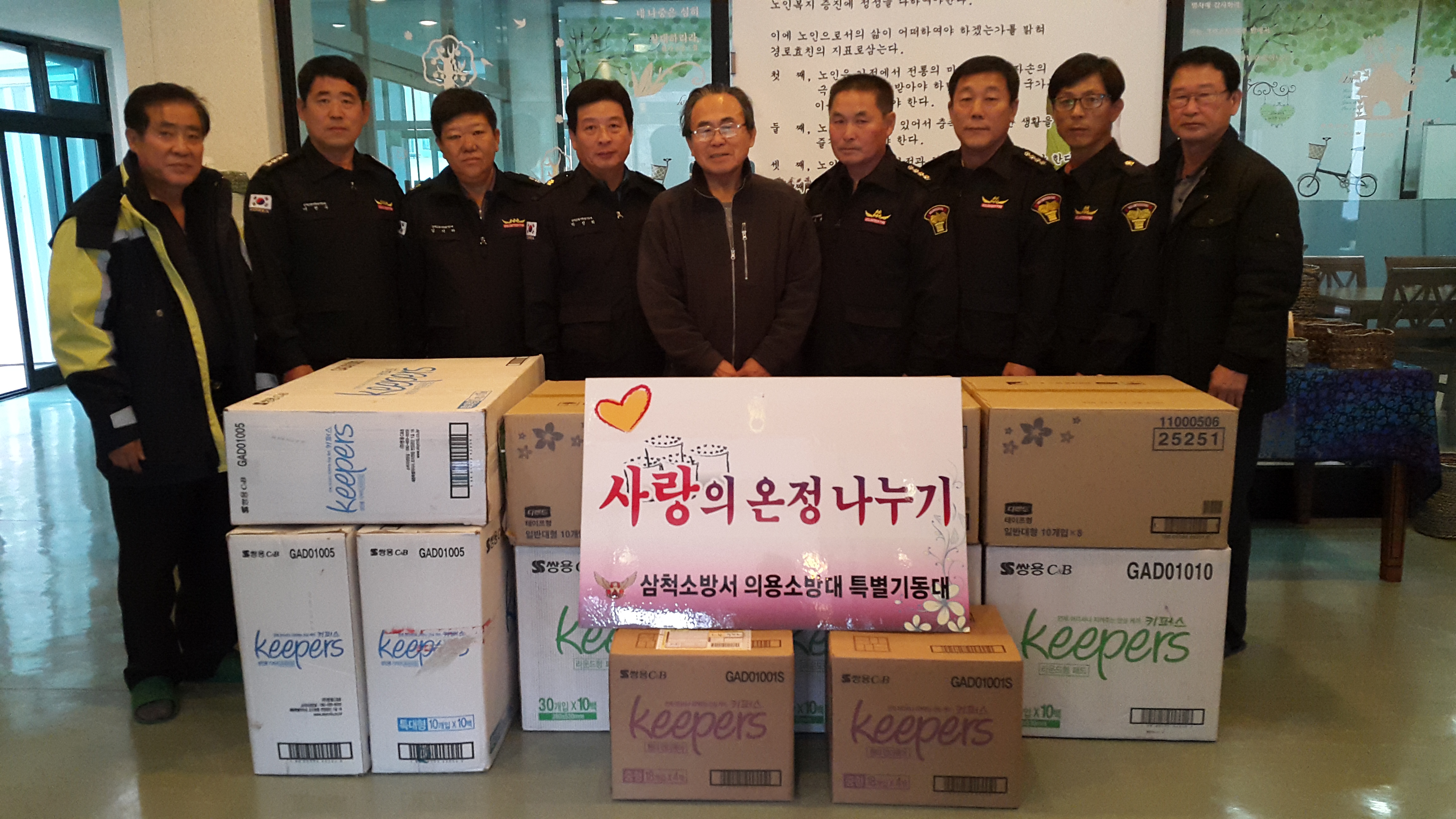 삼척소방서 의용소방 119특별기동대 대장 이천우외 16명대원은 2015년 12월5일(토) 삼척시 원덕읍 월천리 소재 동산복지마을 노인 요양원에오셔서 50만원 상당의 위생용품과 추운날씨에도 주변 청소를 해주셔서 그 따뜻한 마음과 경로의식에 감동받아 이렇게 칭찬의 글을 남김니다.