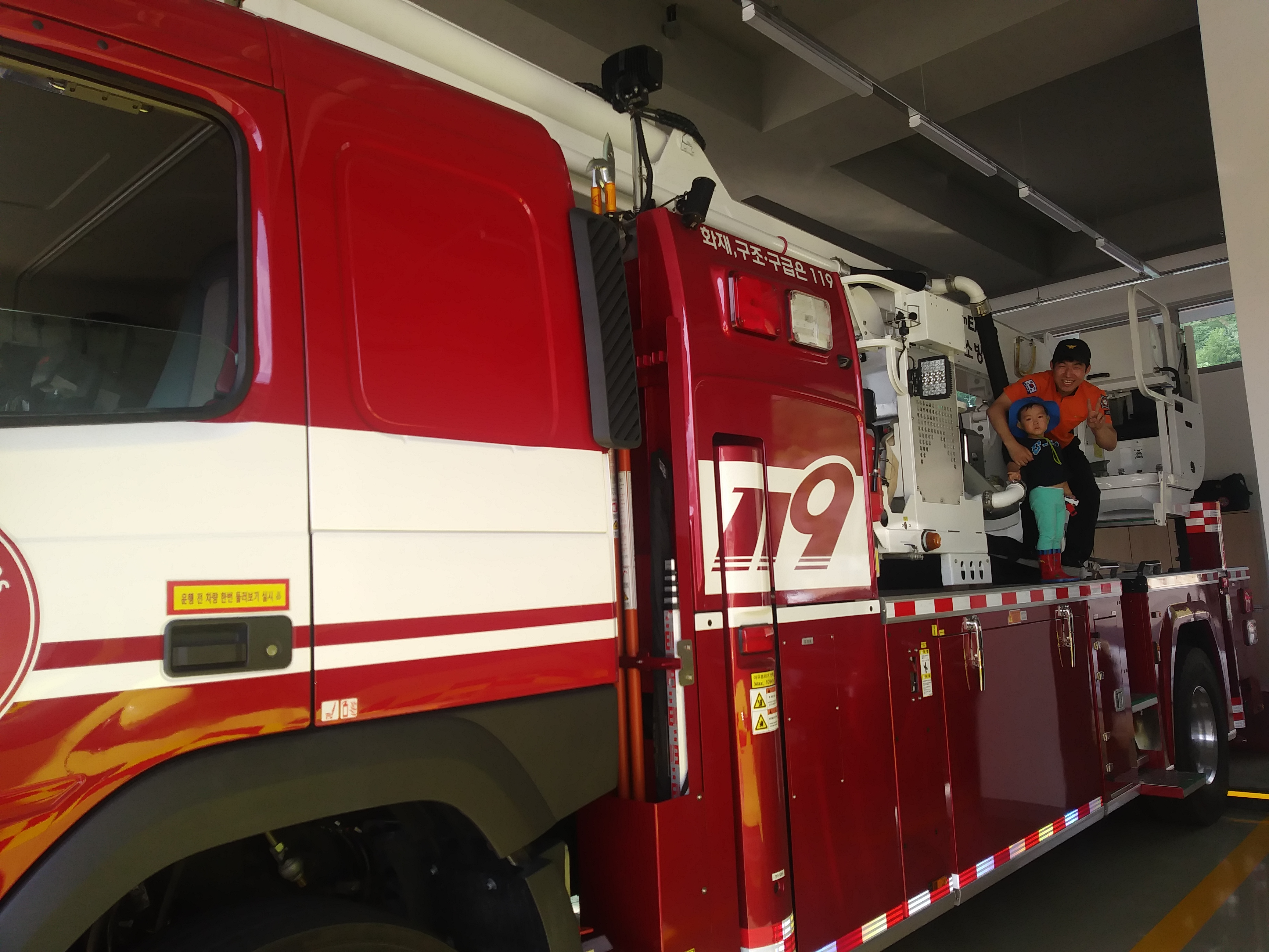이날도 잠시 구경만 하고 돌아오기로 아이와 약속하고 갔던 터에 생각지도 못하게 소방차에 타보게 되어
