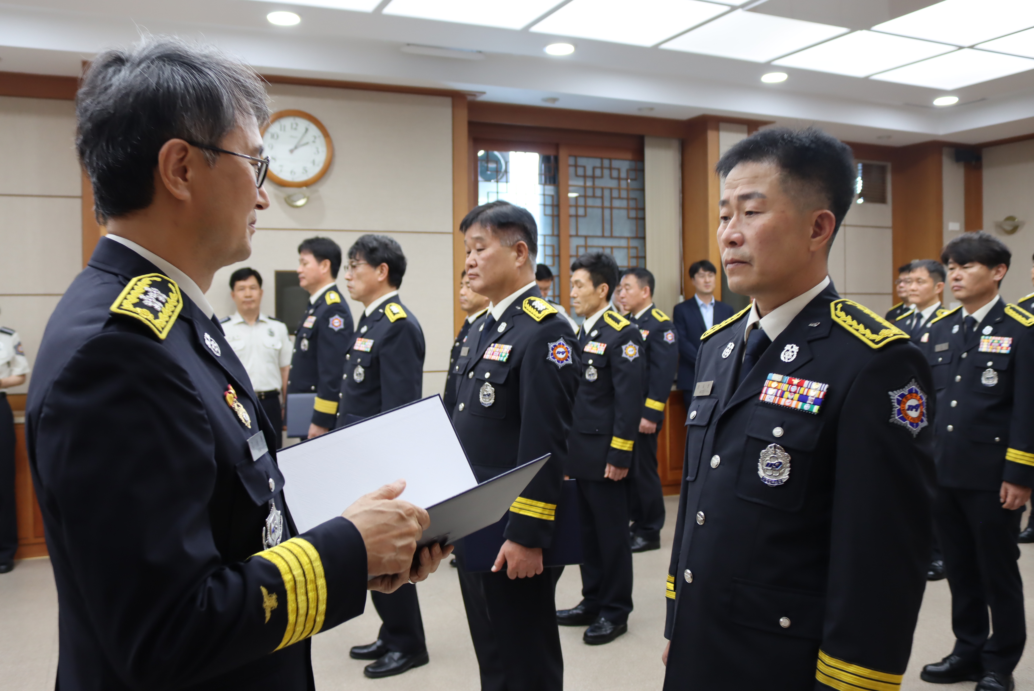 강원특별자치도청 본관 2층 소회의실에서 소방정 및 소방령 임명장 수여식을 개최했다.