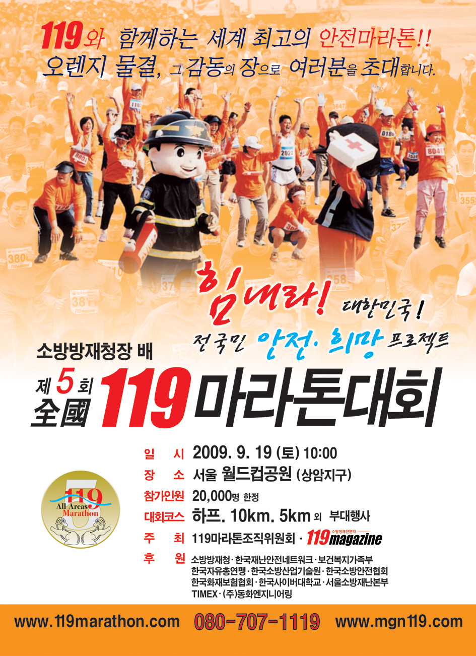 국가적 브랜드 수호천사 119를 통해 Global 경제위기로 지쳐있는 全 국민들에게 「힘내라! 대한민국!! 안전?희망 119프로젝트 마라톤 대회」를 개최, 희망?응원 메시지를 전달하여 다시 힘을 갖고 출발하는데 도움을 주고자 도민과 소방공무원, 의용소방대원, 소방산업체종사자, 소방관련 종사자등이 함께하는 「소방방재청장배 제5회 전국119마라톤대회」일정을 알려 드리니, 관심있는 의용소방대원들의 많은 참여 부탁드립니다.