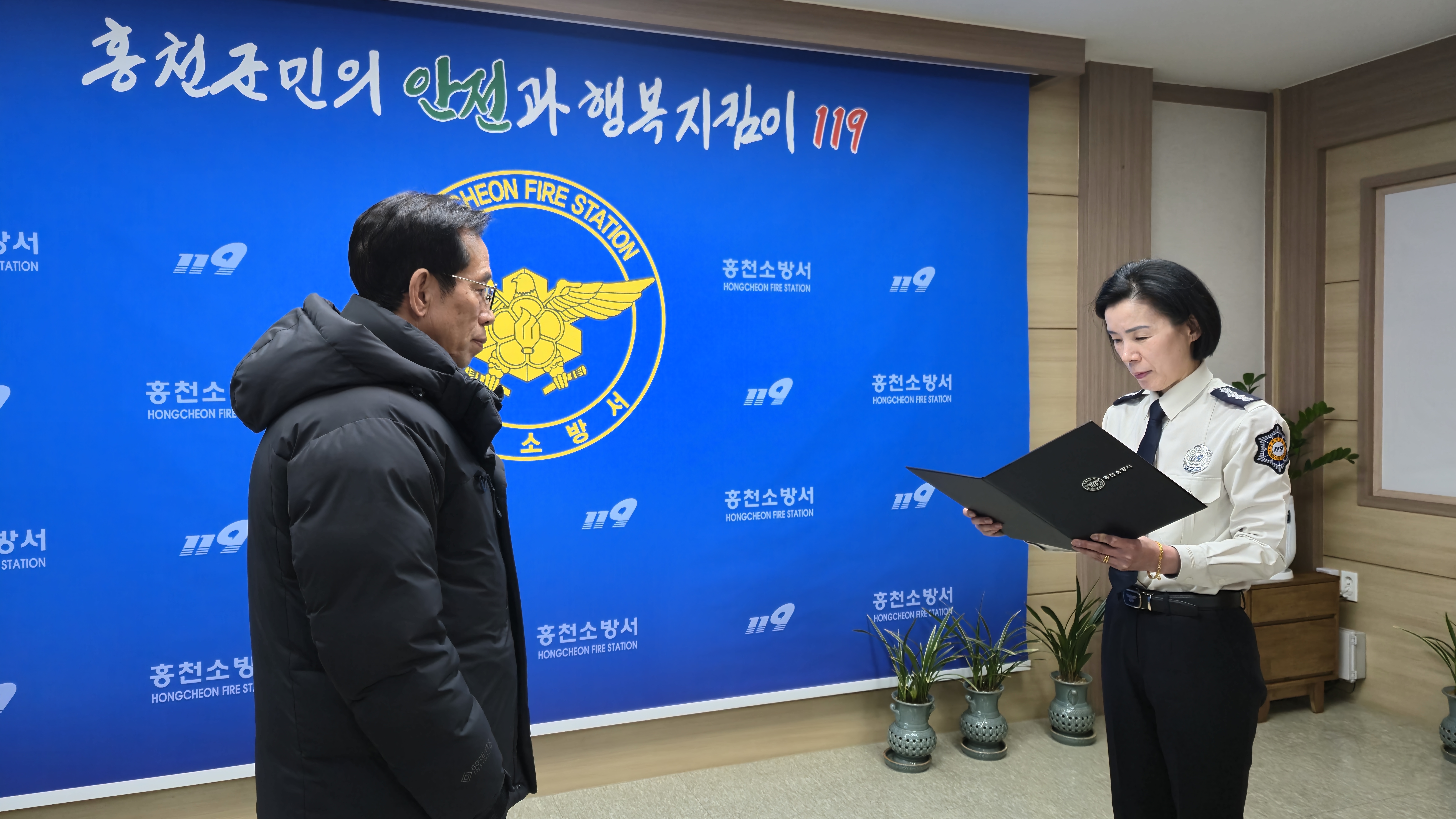 | 1086 | 홍천소방서, 화재 초기 진압한 민간인 이순범 씨 유공 표창 | 홍천홍보 | 2025-01-16 | 371 | |