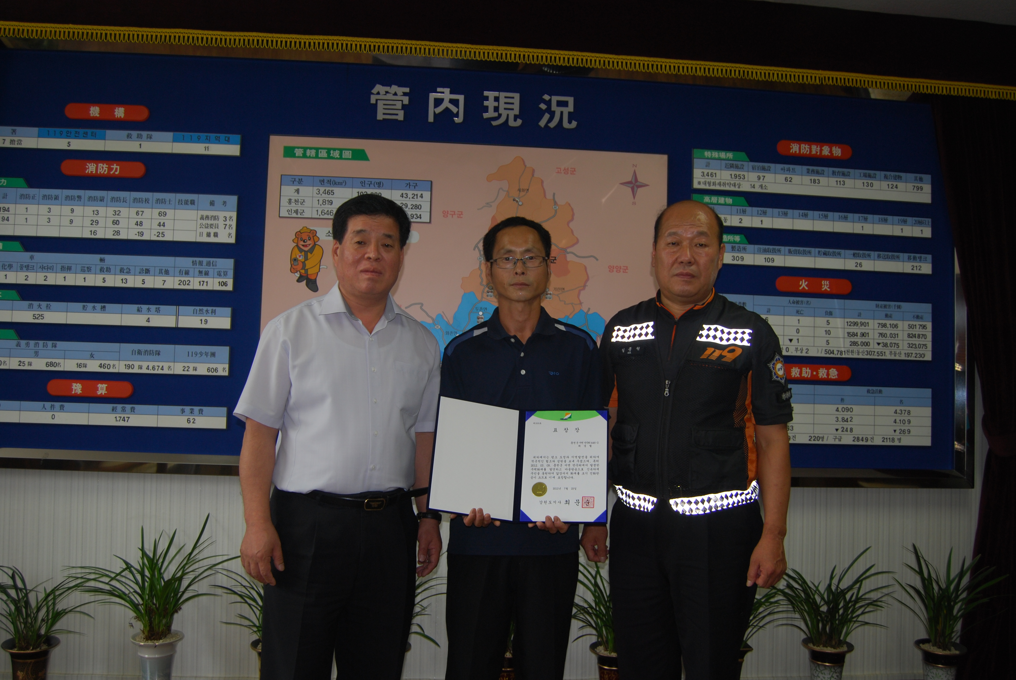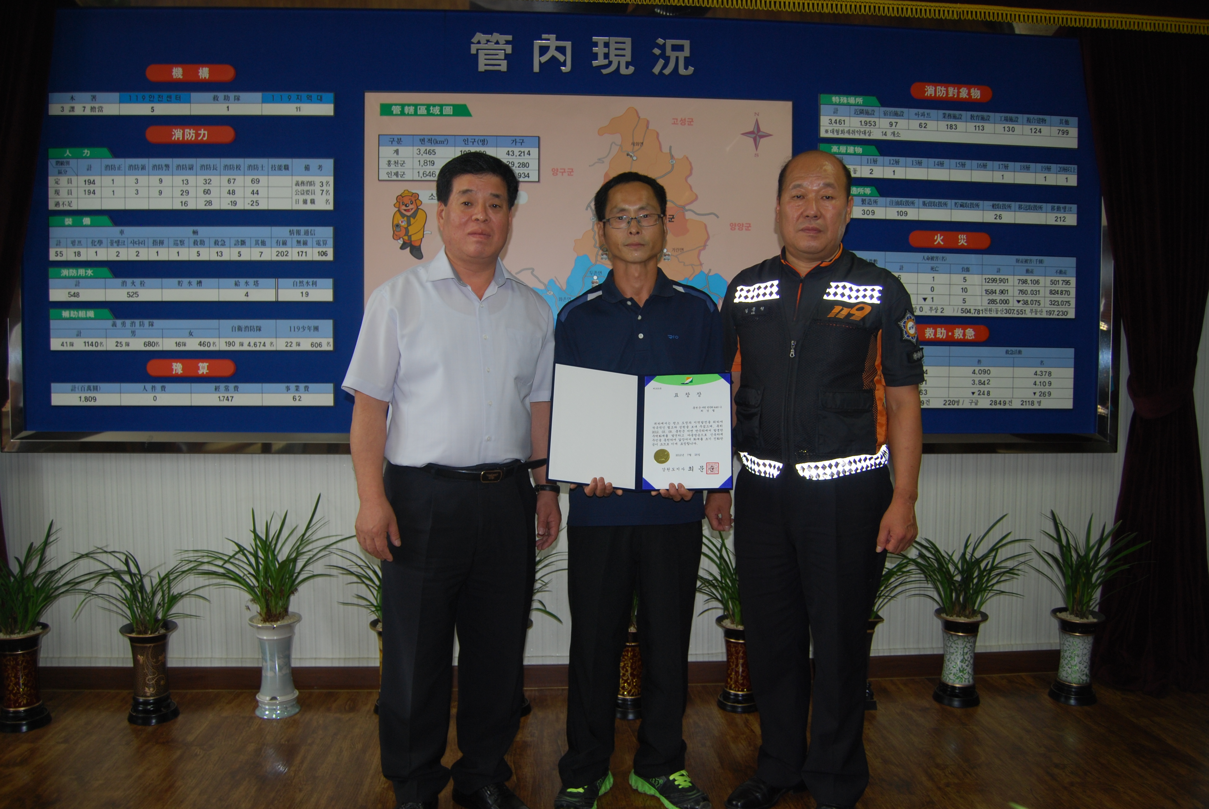 홍천소방서(서장 이종진)는 지난 3월9일 서면 반곡리 주택 화재발생시 소방대 도착전 신속정확한 초기대응으로 인명과 재산피해를 방지한 서면 의용소방대원 최경렬(남/44)대원에게 도지사 표창을 전수했다.