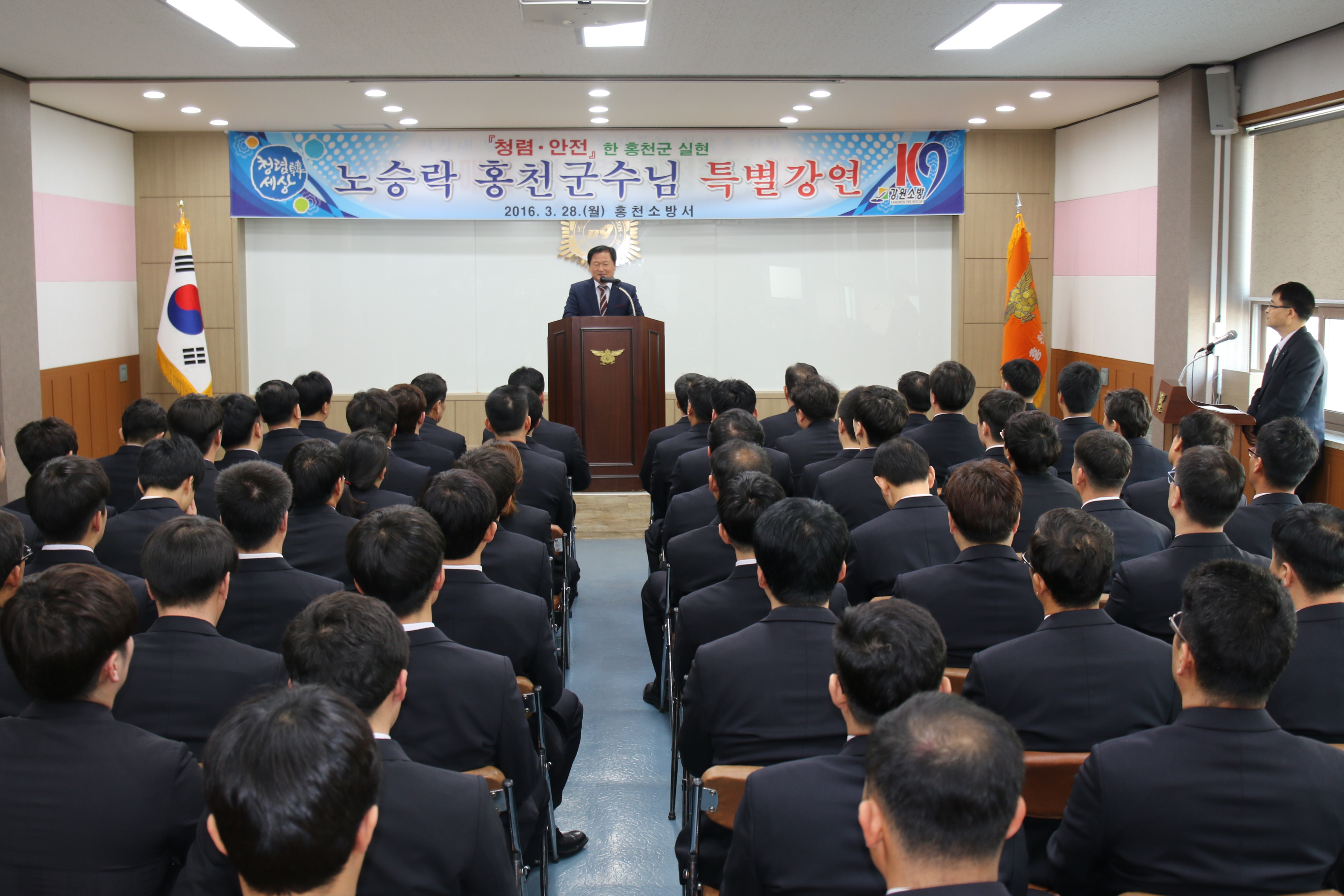 홍천소방서에서는 3월 28(월) 오전 10시에 노승락 홍천군수님을 초청하여, 『청렴한 공무원상 및 귀농귀촌(꿈에그린 전원도시 홍천) 특수계획과 소방안전』이라는 제목으로 특별강연을 실시하였다.