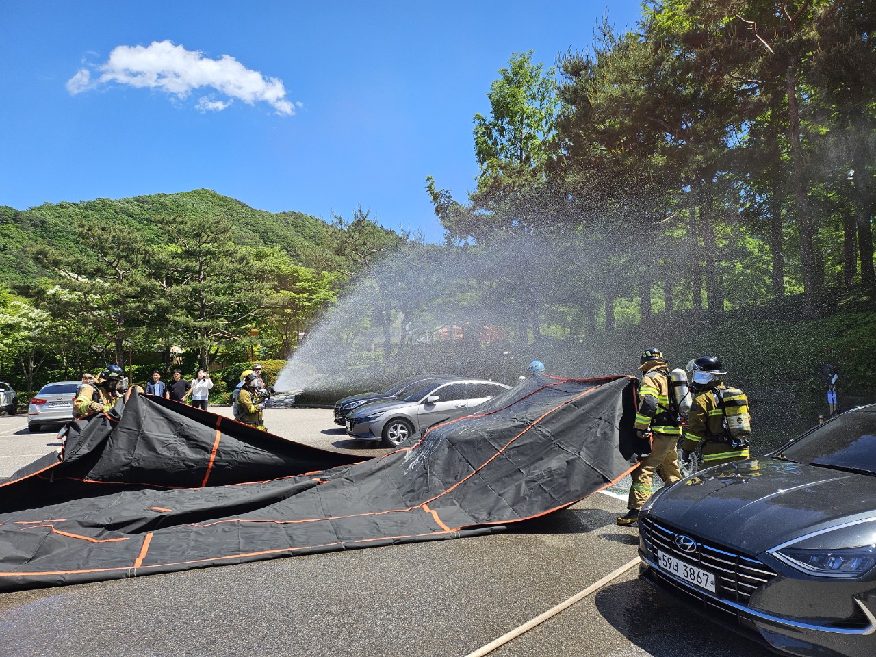 이번 훈련에는 소방차 4대와 팔봉119안전센터(센터장 신승규) 직원들 포함 인원 20여 명이 참여하여 초기소화, 질식소화포 전개, 하부 주수관창 소화, 소방차량 방수 등 전기차 화재에 대한 신속하고 효율적인 대응 훈련을 했습니다.