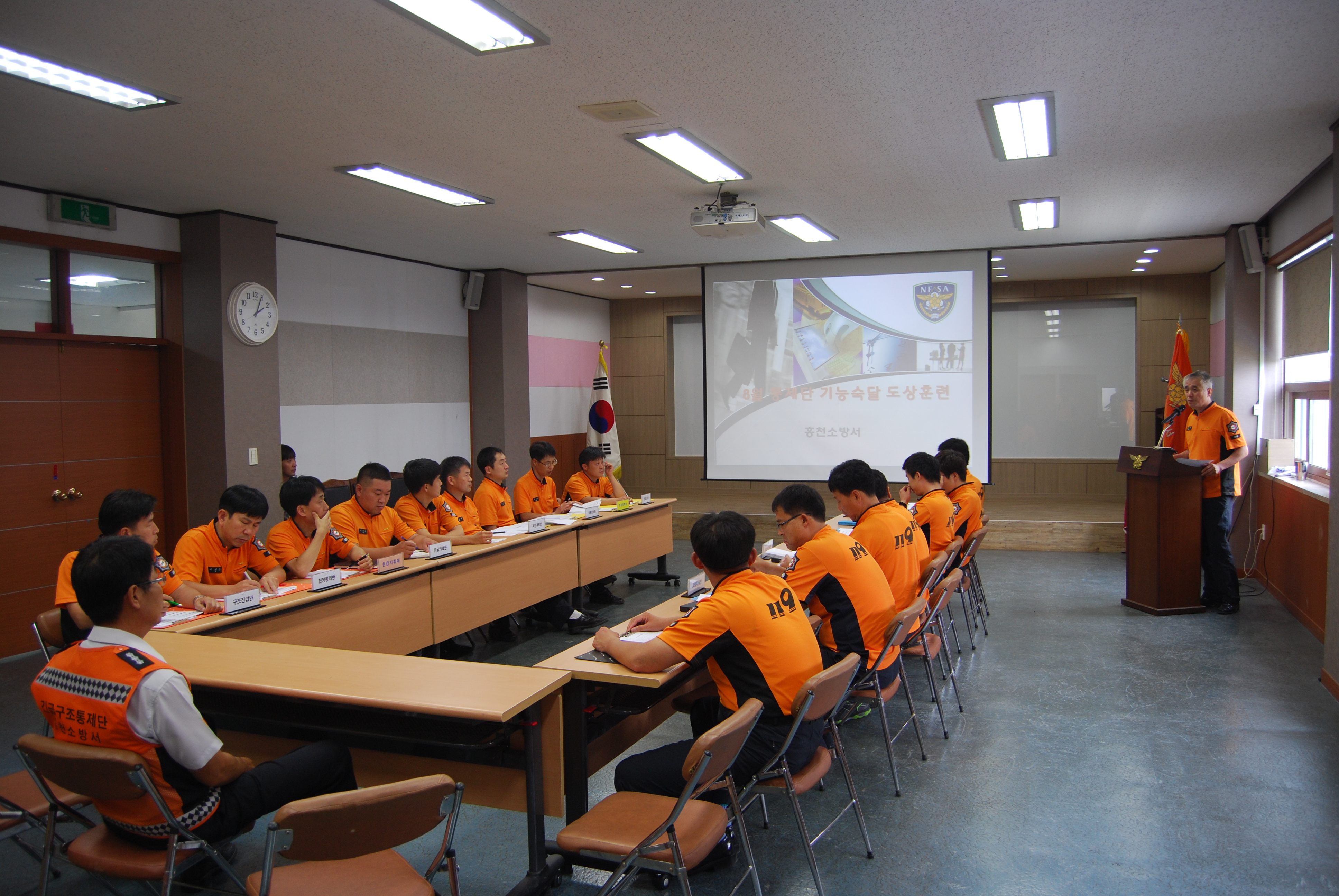홍천소방서(서장 이지만)는 8월29일 오후 2시 대회의실에서 ‘홍천군 남면 며느리재터널에서 버스와 덤프트럭 충돌해 인명피해 24명, 재산피해 1억원이 발생했다’는 가상 메시지에 따라 신속하게 긴급구조통제단 도상훈련을 실시했다.