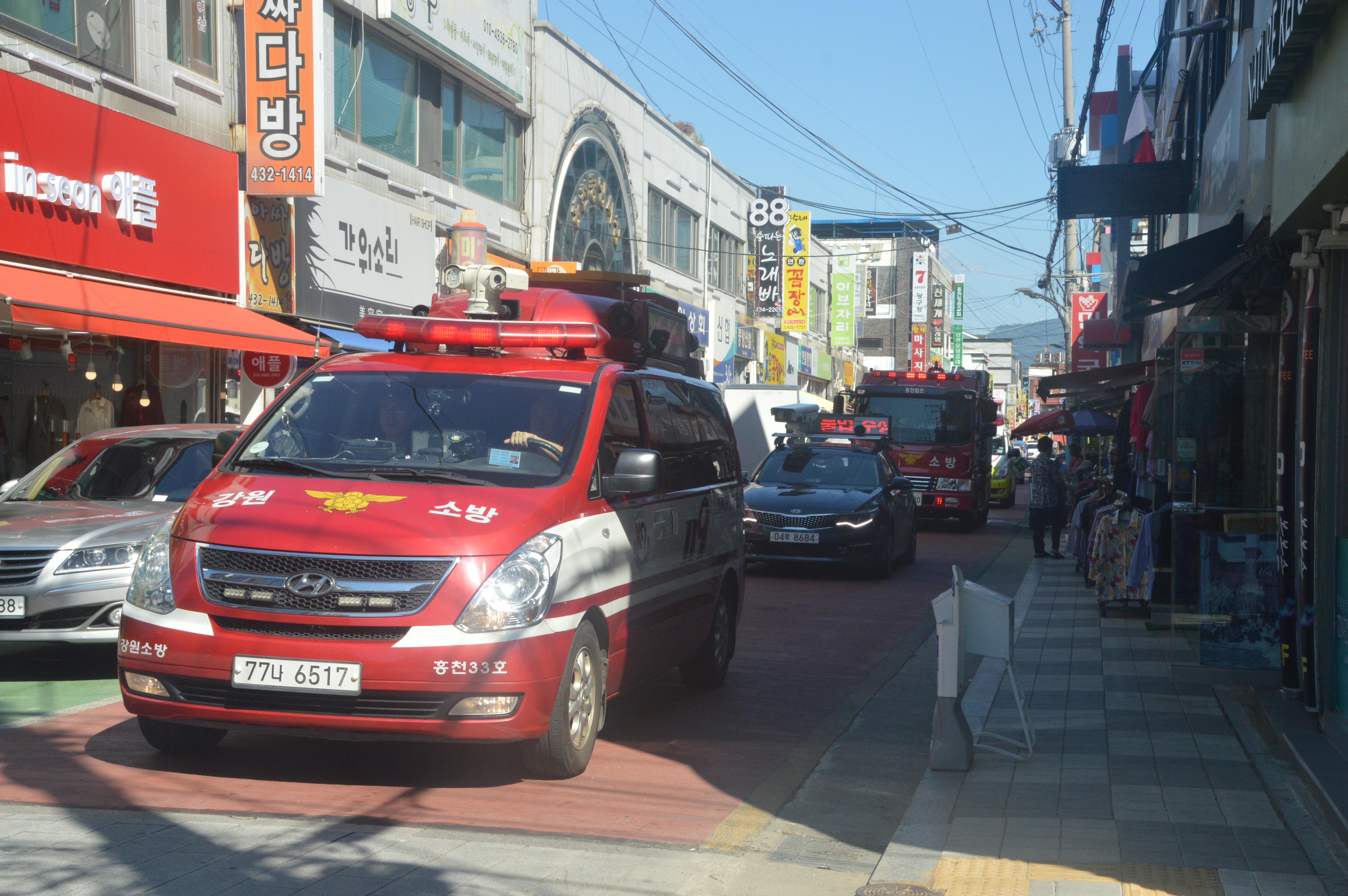 □ 훈련구간은 홍천소방서를 출발해 홍천 중앙시장, 홍천시장을 지나 소방서로 돌아오는 구간으로 실시하였으며, 관내 양덕원119 및 서석119안전센터에서도 주택가 골목 등 통행 장애 지역을 중심으로 동시에 실시하였다.