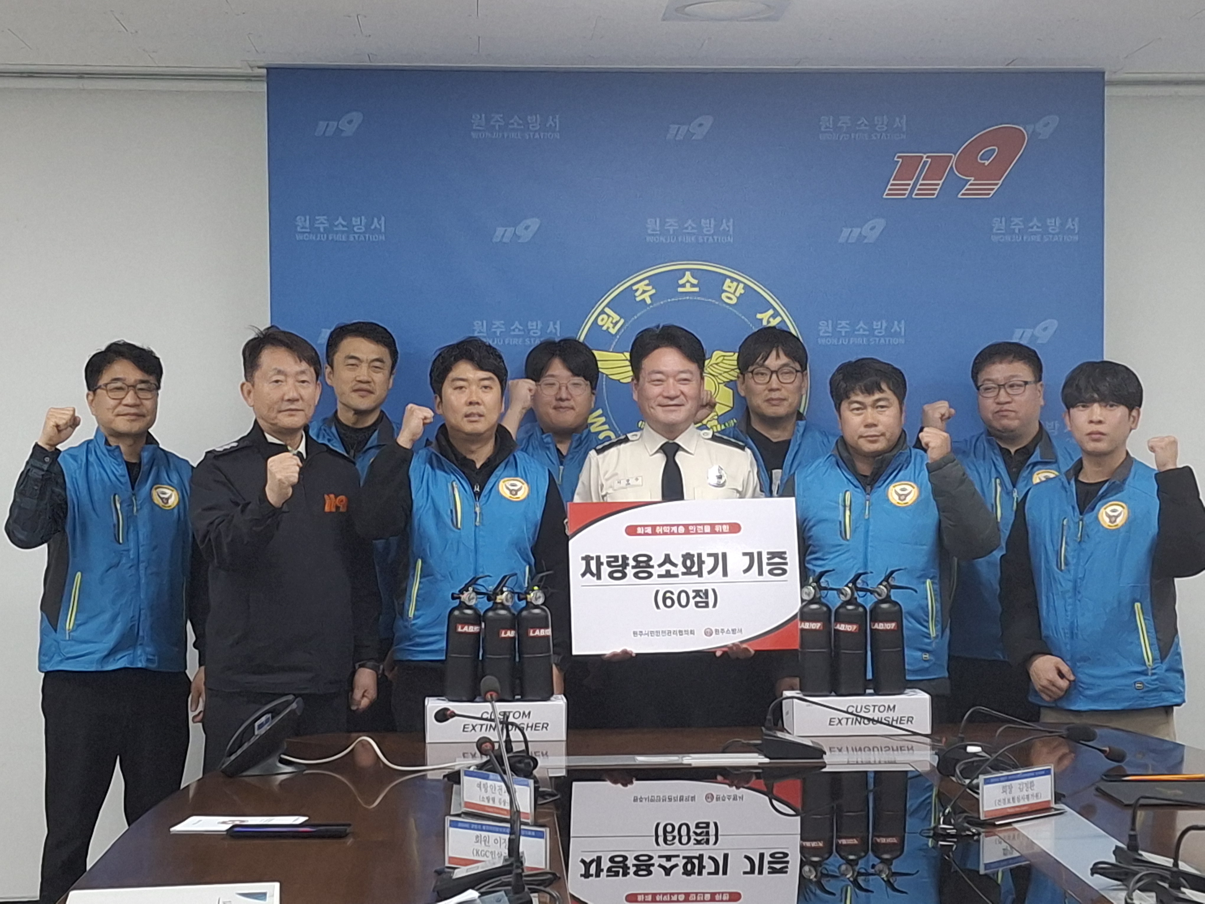 회의에 앞서 차량용 소화기 60점을 원주소방서에 기증하였다.