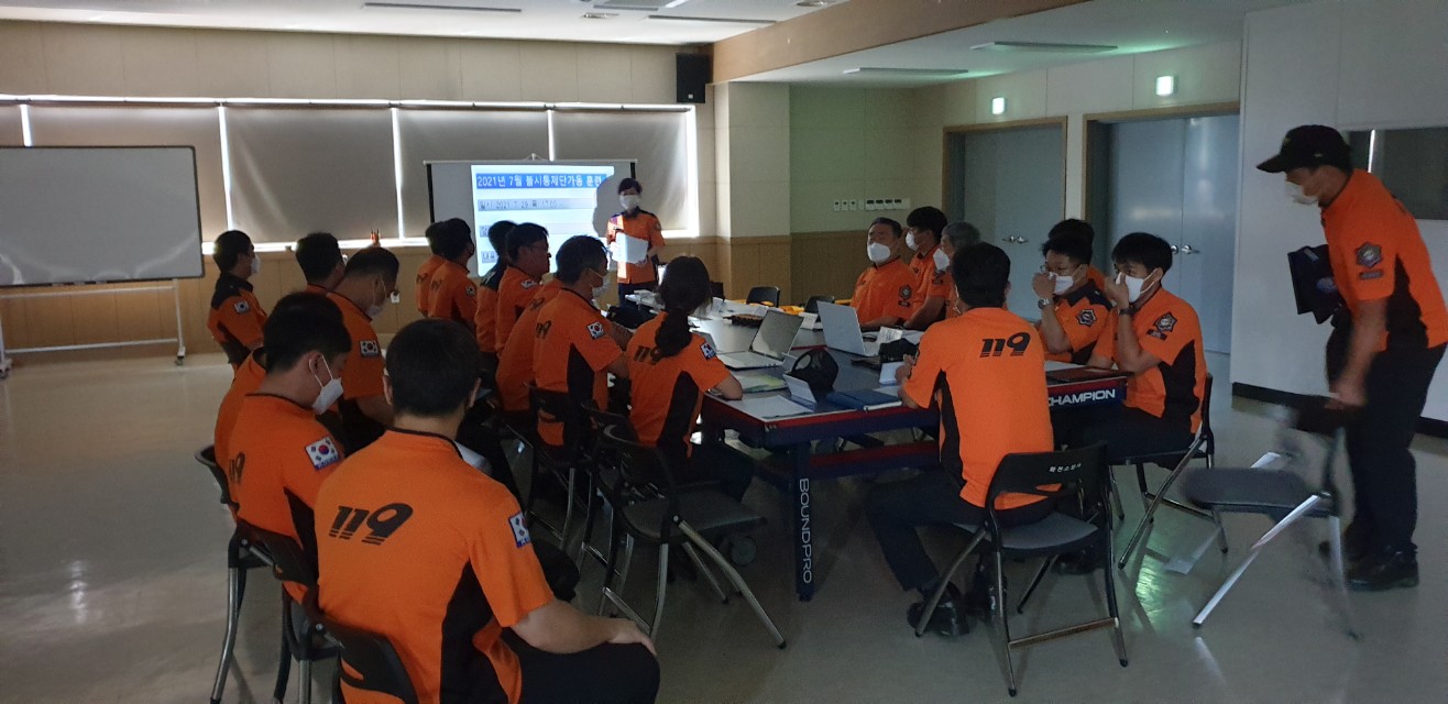 ○ 훈련은 1차적으로 대회의실에 모여 가상의 훈련 상황을 전파하고 도상훈련을 진행한 후에 화천소방서 후정에서 실제로 긴급구조통제단 차량을 운용, 지휘소를 설치하고 통제단 훈련을 이어서 실시했다.
