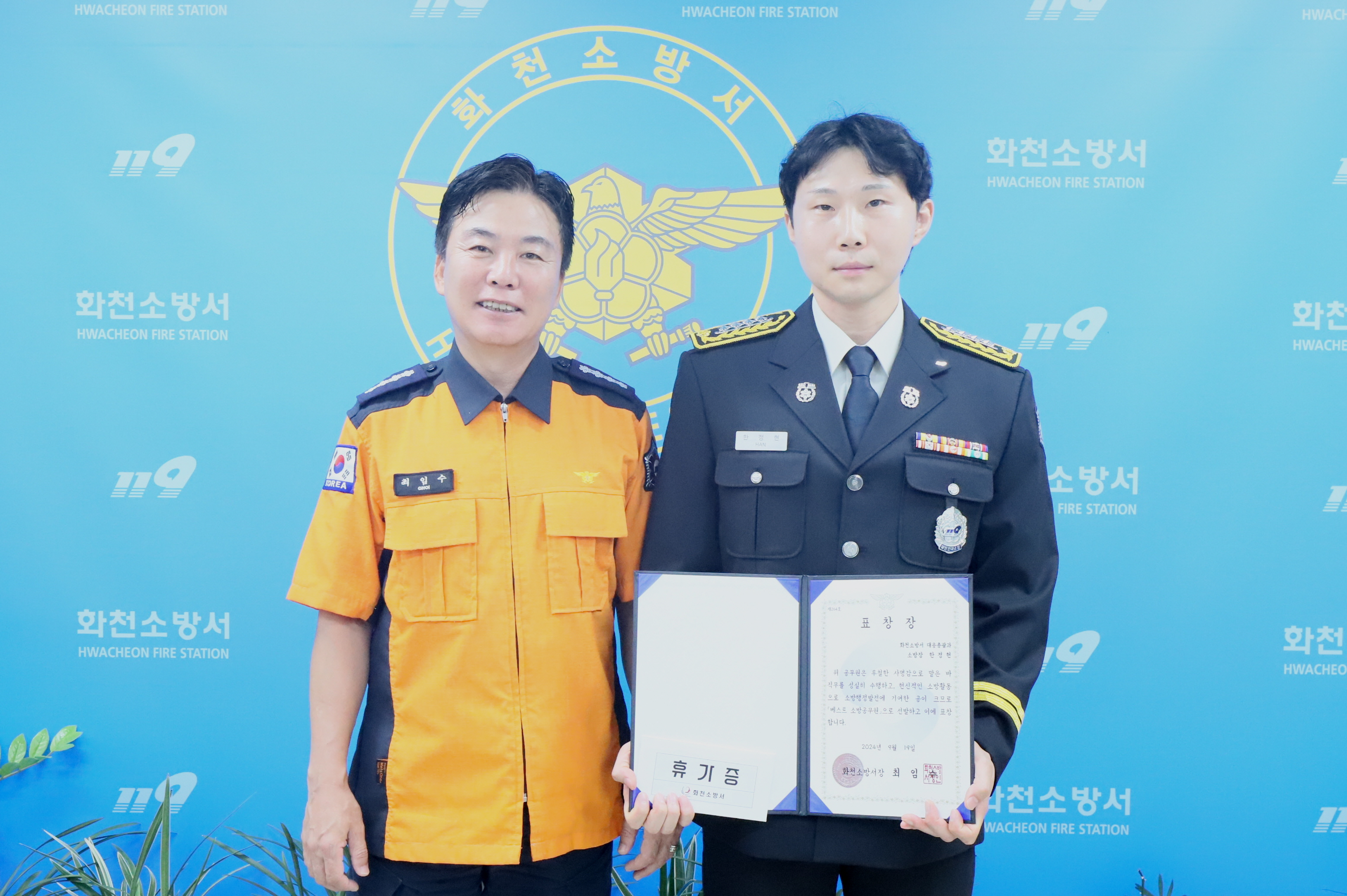 최임수 서장은 “축하드리며 평소 성실한 직무 수행과 퇴근길 화재 진압까지 우리 소방을 빛내준 것에 감사의 마음을 전한다”고 전했다.
