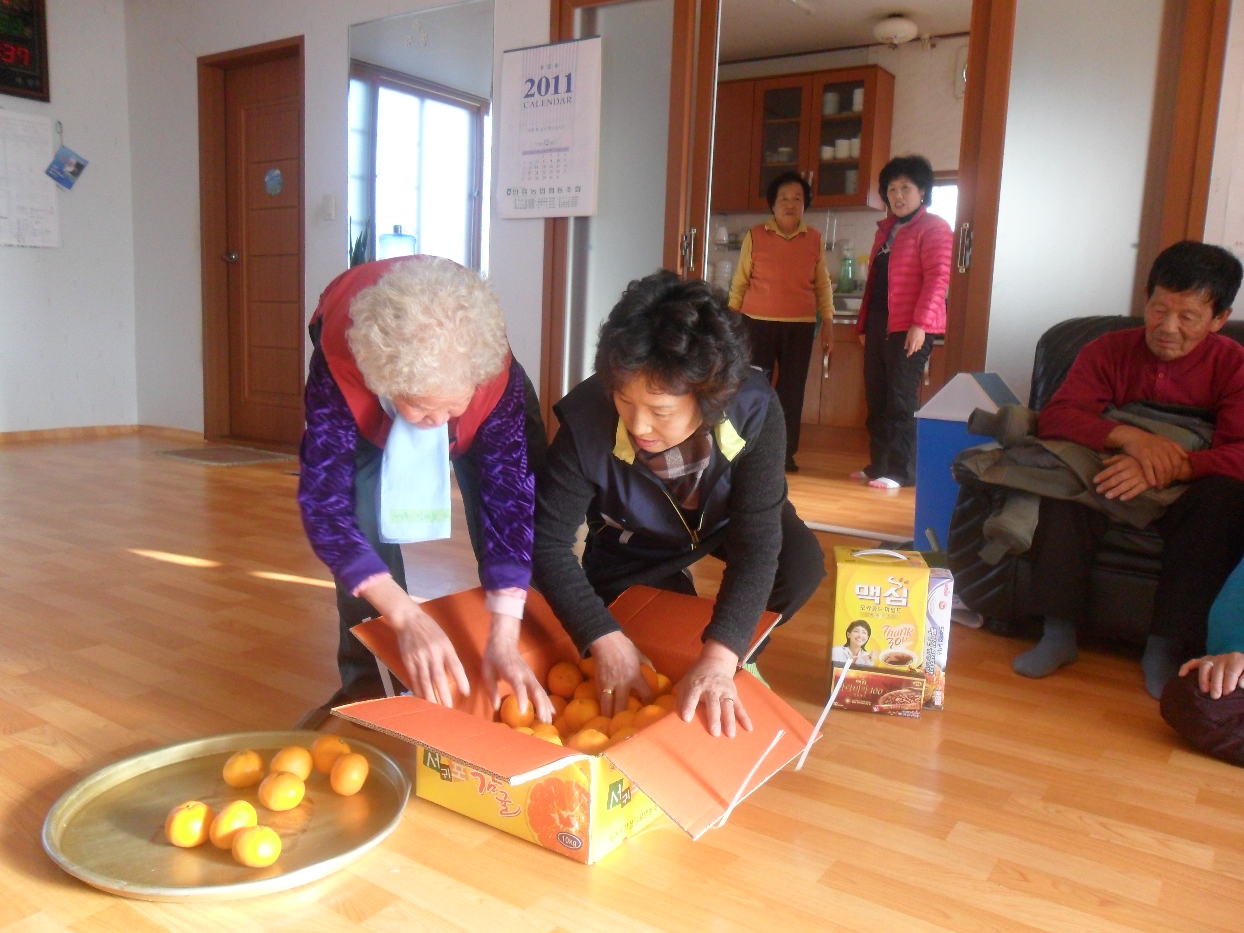 경로당을 방문하여 어르신들에게 비타민이 풍부한 귤을 전달하고