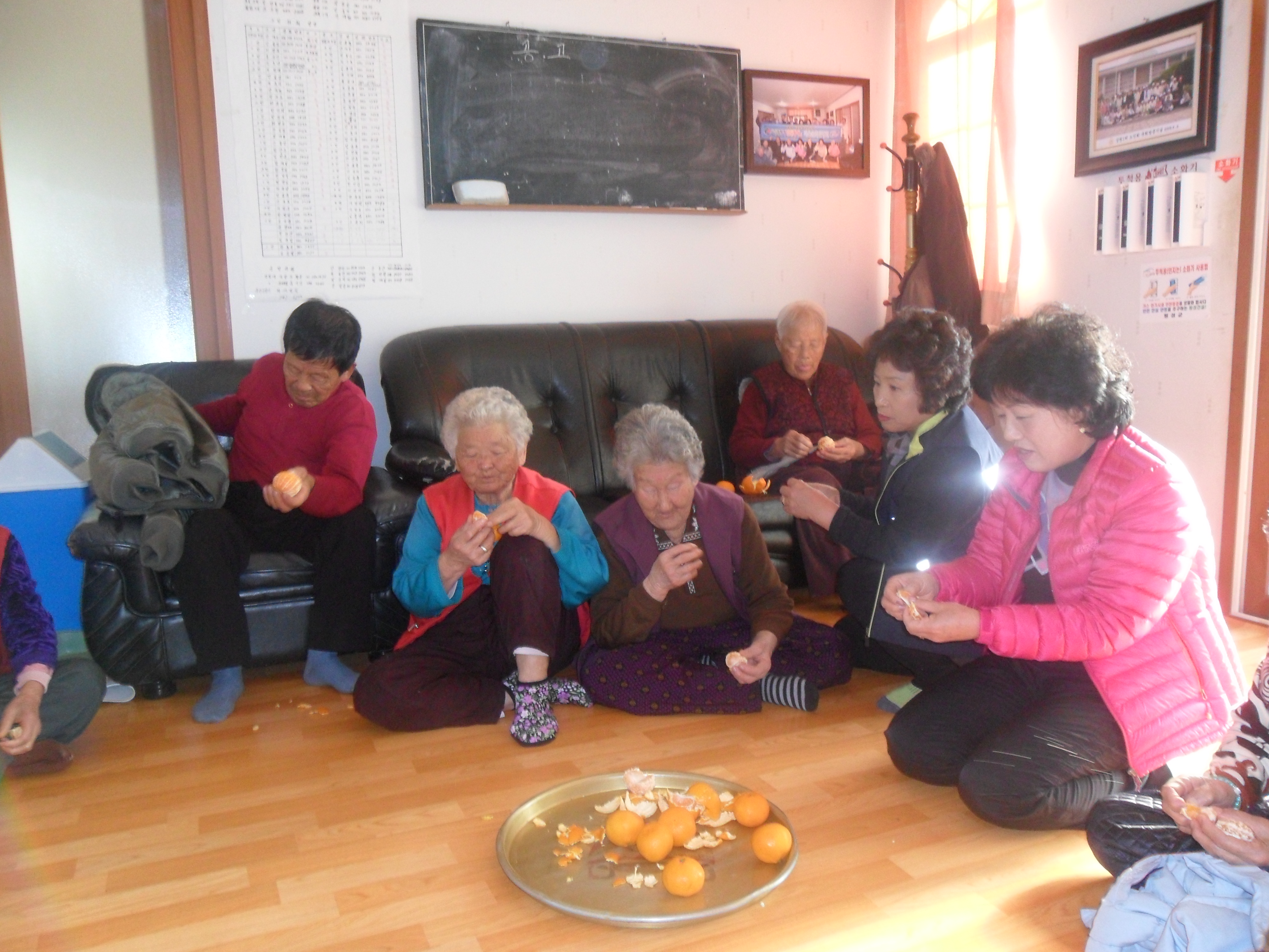대장님과 총무님께서는 귤 껍질을 직접까서 어르신들 입에다 넣어드리며