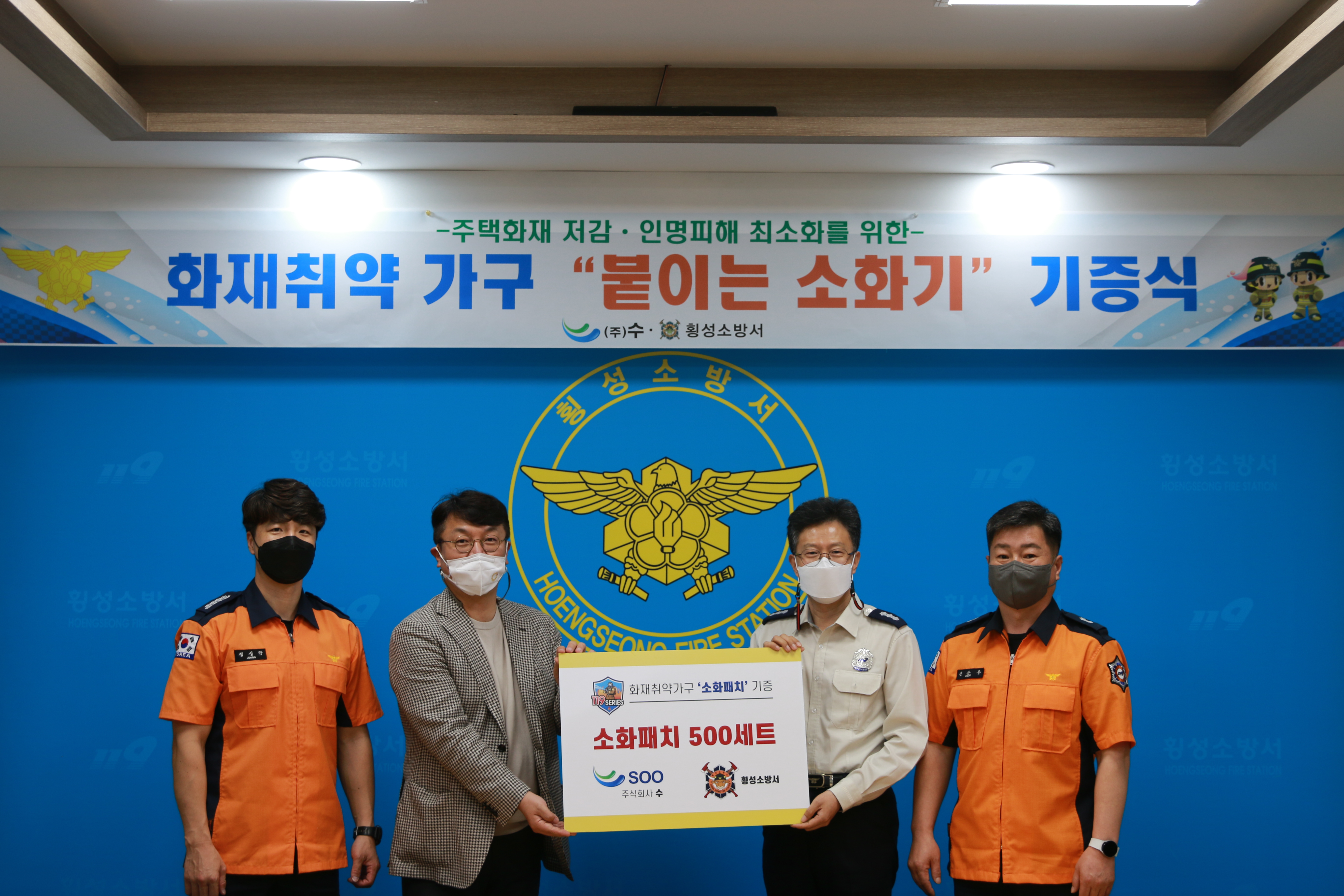 횡성소방서(서장 염홍림)는 2일 부산 강서구의 주식회사 수(대표이사 황득규)에서 110만원 상당의 전기 화재 예방 콘센트용 ‘붙이는 소화기(119스티커)’ 500점을 기부해 기증식을 실시했다고 밝혔다.