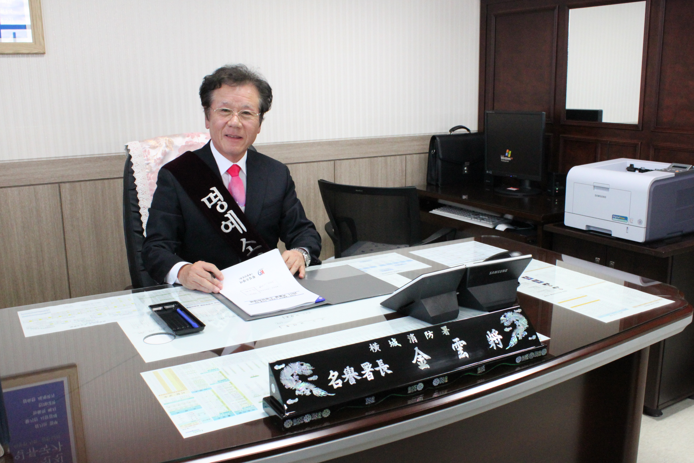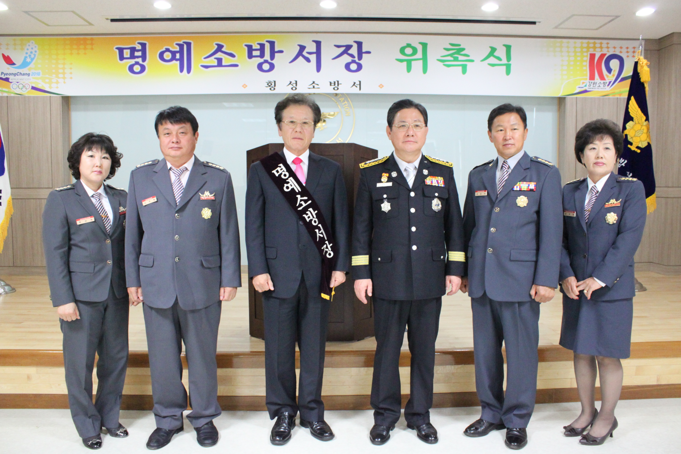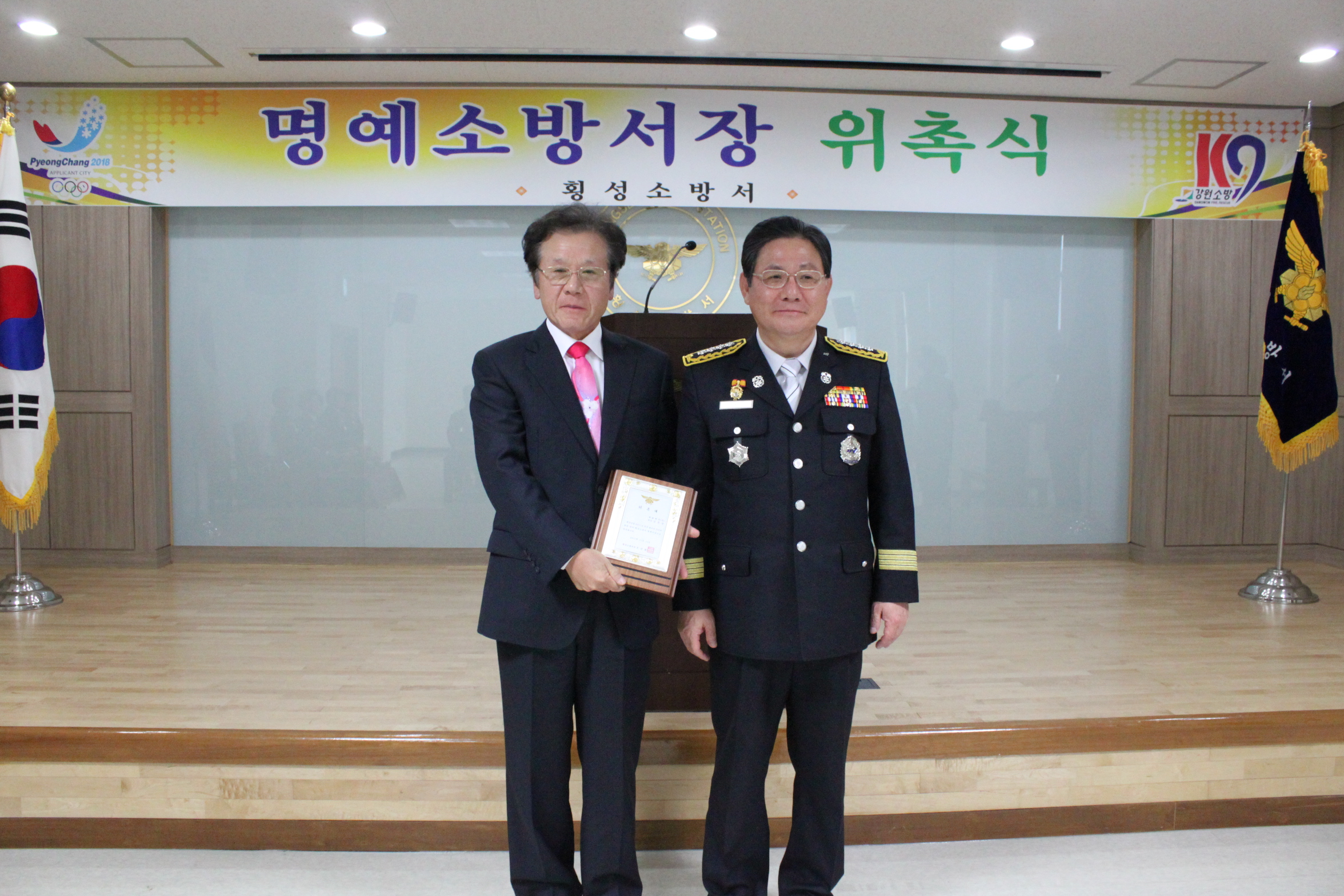 횡성소방서(서장 조근희)에서는 11. 11(금) 대화제약(주)의 김운장 회장님을 모시고 1일 명예소방서장 취임식을 하였습니다.
