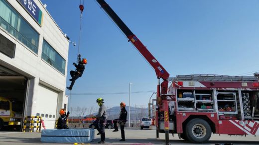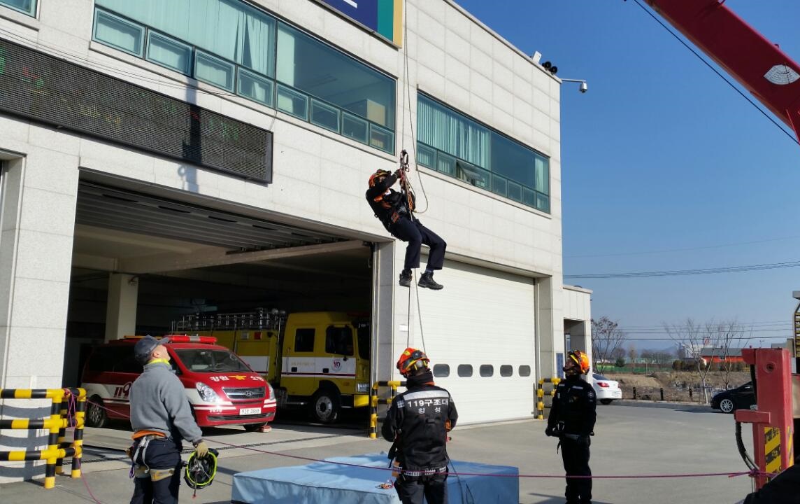 1월 12일 우리 구조대에서는 크레인을 이용한 로프 등반 및 하강,