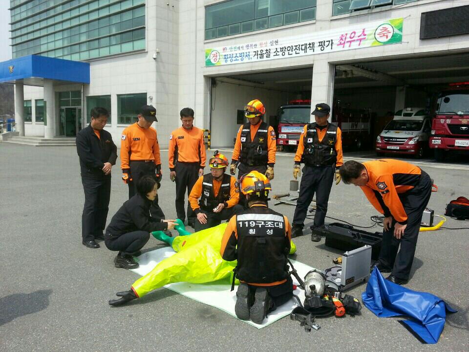 구조장비 숙달훈련 겸 신규장비 교육, 소방서장님 장비 시연을 실시하였습니다.