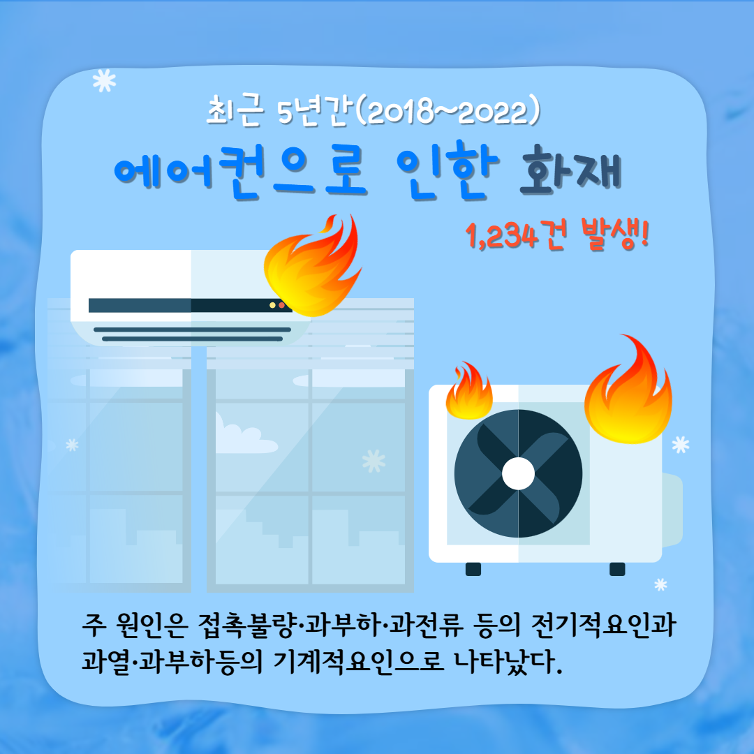최근 5년간 에어컨으로 인한 화재가 1,234건이나 발생하였습니다. 이에 본격적으로 가동전에 자가점검을 하고 안전성능 확인 후에 사용하여 안전하고 시원한 여름나기에 동참하여 주세요!