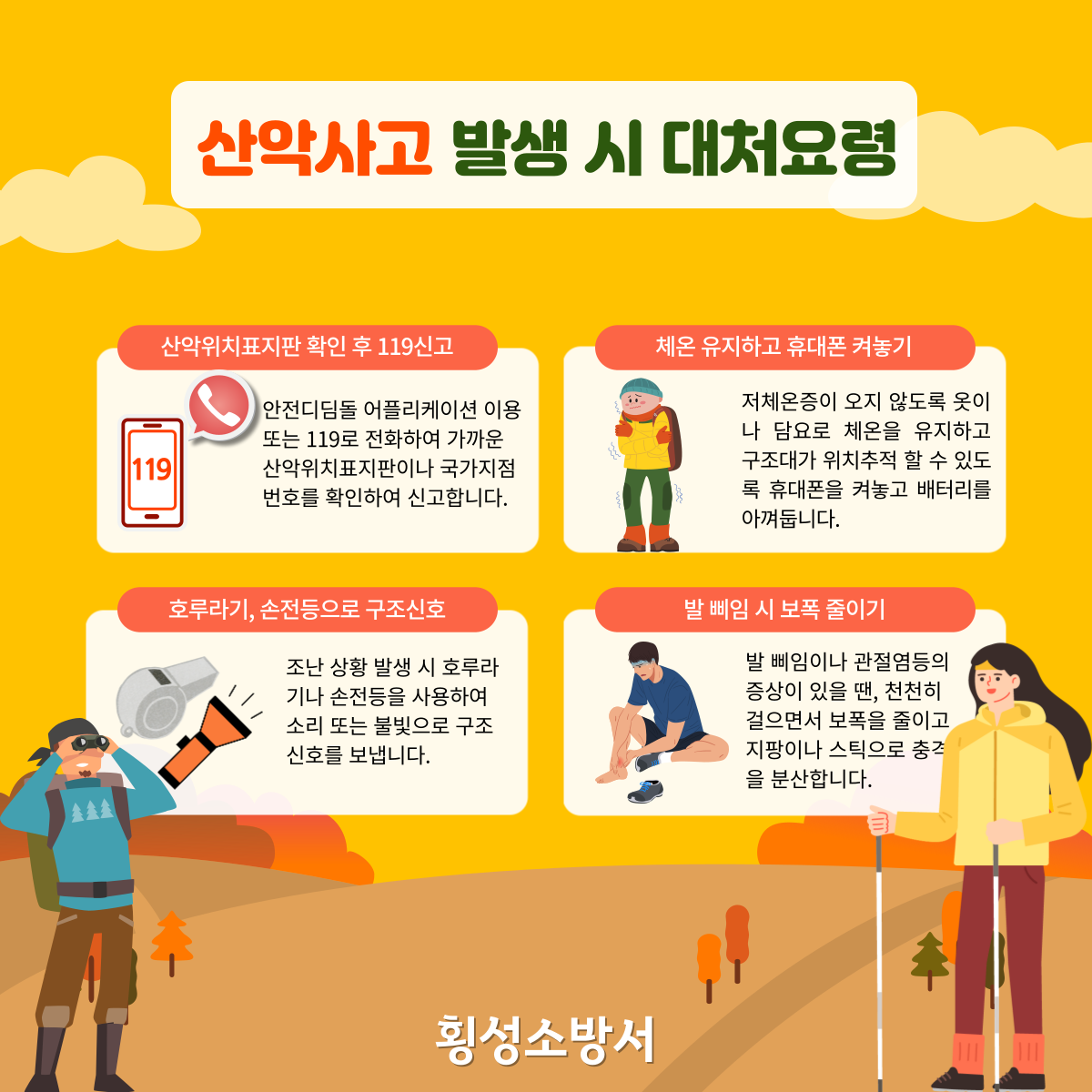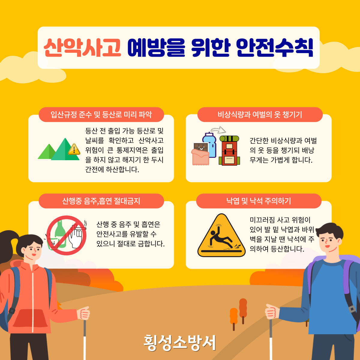 가을 산행 전 산악사고 예방을 위한 안전수칙을 준수하고 사고 발생 시 대처요령을 통하여 피해를 줄이고 안전하고 즐거운 등산 하시길 바랍니다!