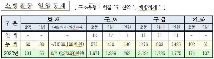 ○ 구조 18건(벌집 16, 산악 1, 예방경계 1)