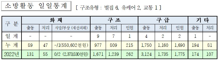 ○ 구조 9건(벌집 6, 유케어 2, 교통 1)