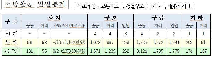 ○ 구조 4건(교통사고 1, 동물구조 1, 기타 1, 벌집제거 1)