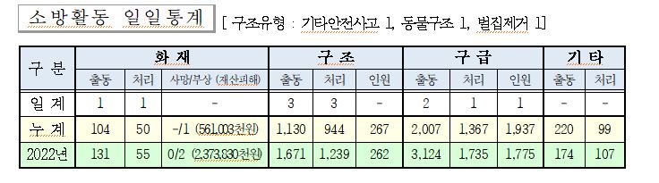 ○ 구조 3건(기타안전사고 1, 동물구조 1, 벌집제거 1)