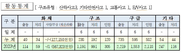 ○ 구조 6건(산악사고3, 기타안전사고 1, 교통사고 1, E/V사고 1)