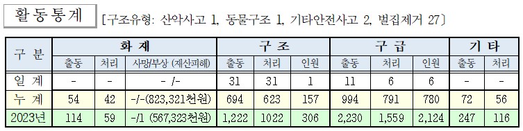 ○ 구조 31건(산악사고1, 기타안전사고 2, 동물구조 1, 벌집제거 27)