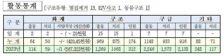 ○ 구조 15건(벌집제거 13, E/V사고 1, 동물구조 1)
