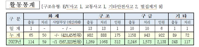○ 구조 13건(벌집제거 9, E/V사고 1, 교통사고 1, 기타안전사고 2)