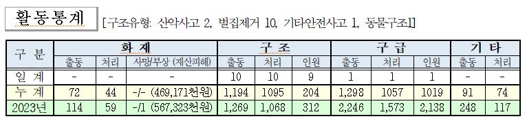 ○ 구조 10건(산악사고 2, 벌집제거 10, 기타안전사고 1, 동물구조1)