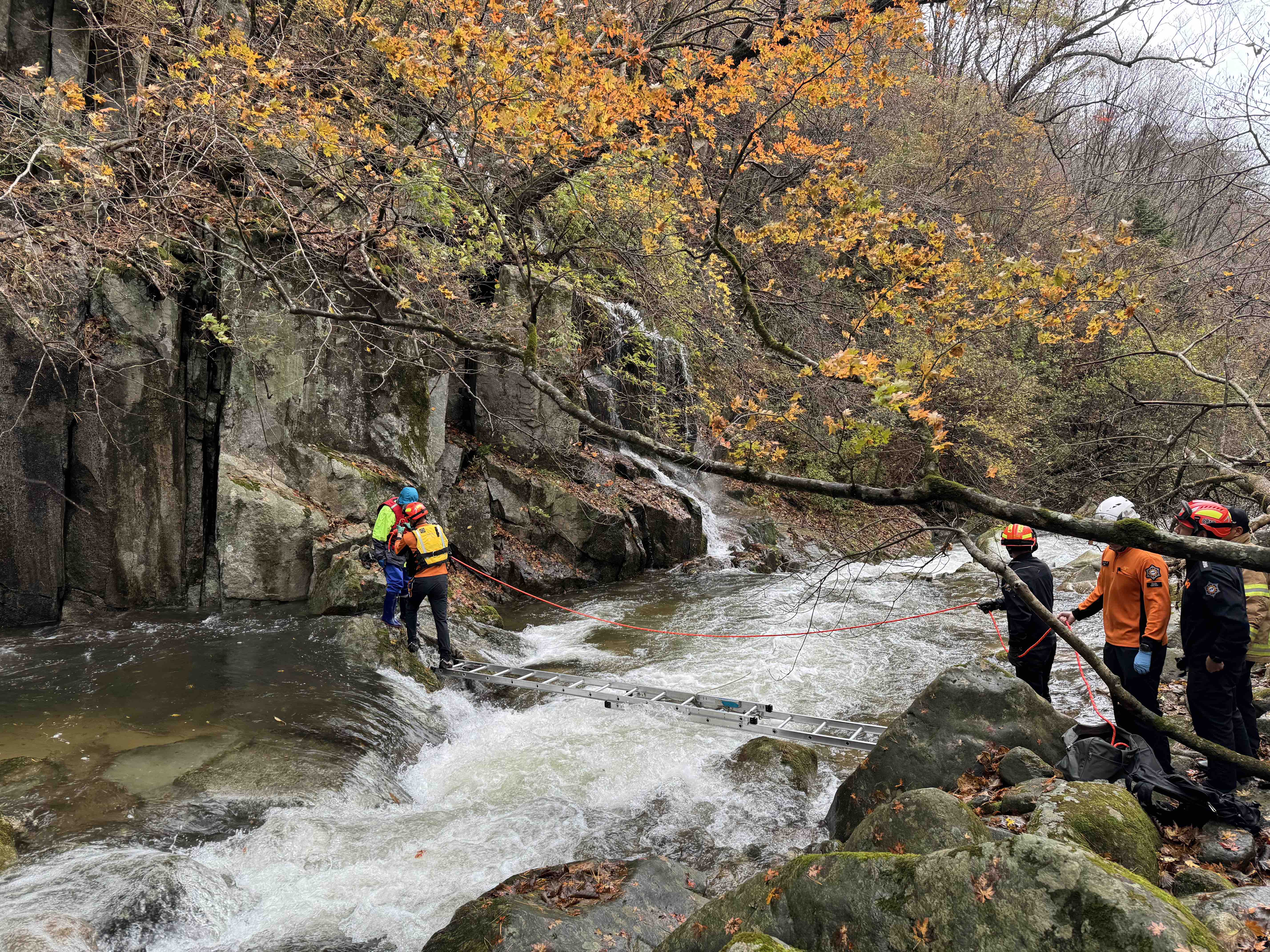 전날 폭우로 계곡 물이 불어 자력탈출이 불가능한 상태였으며, 구조대원은 로프와 사다리를 활용하여 구조대상자를 안전히 구조하였다.