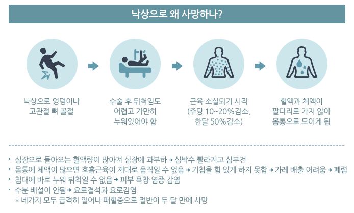 멀쩡하던 노인이 불과 몇 달 만에 사망하기 때문이지요. 어떻게 보면 만성질환보다 더 무서운 게 바로 낙상입니다.