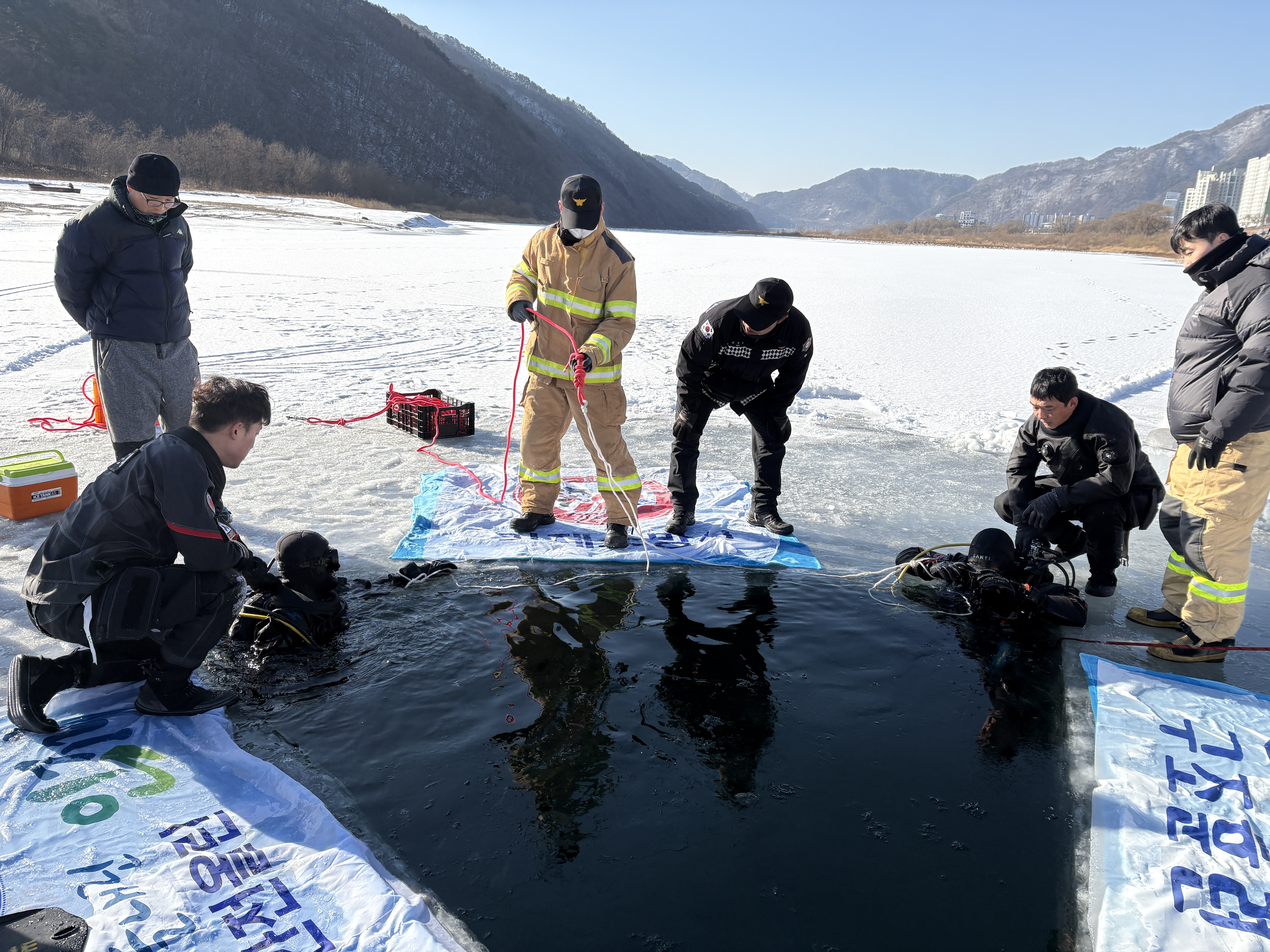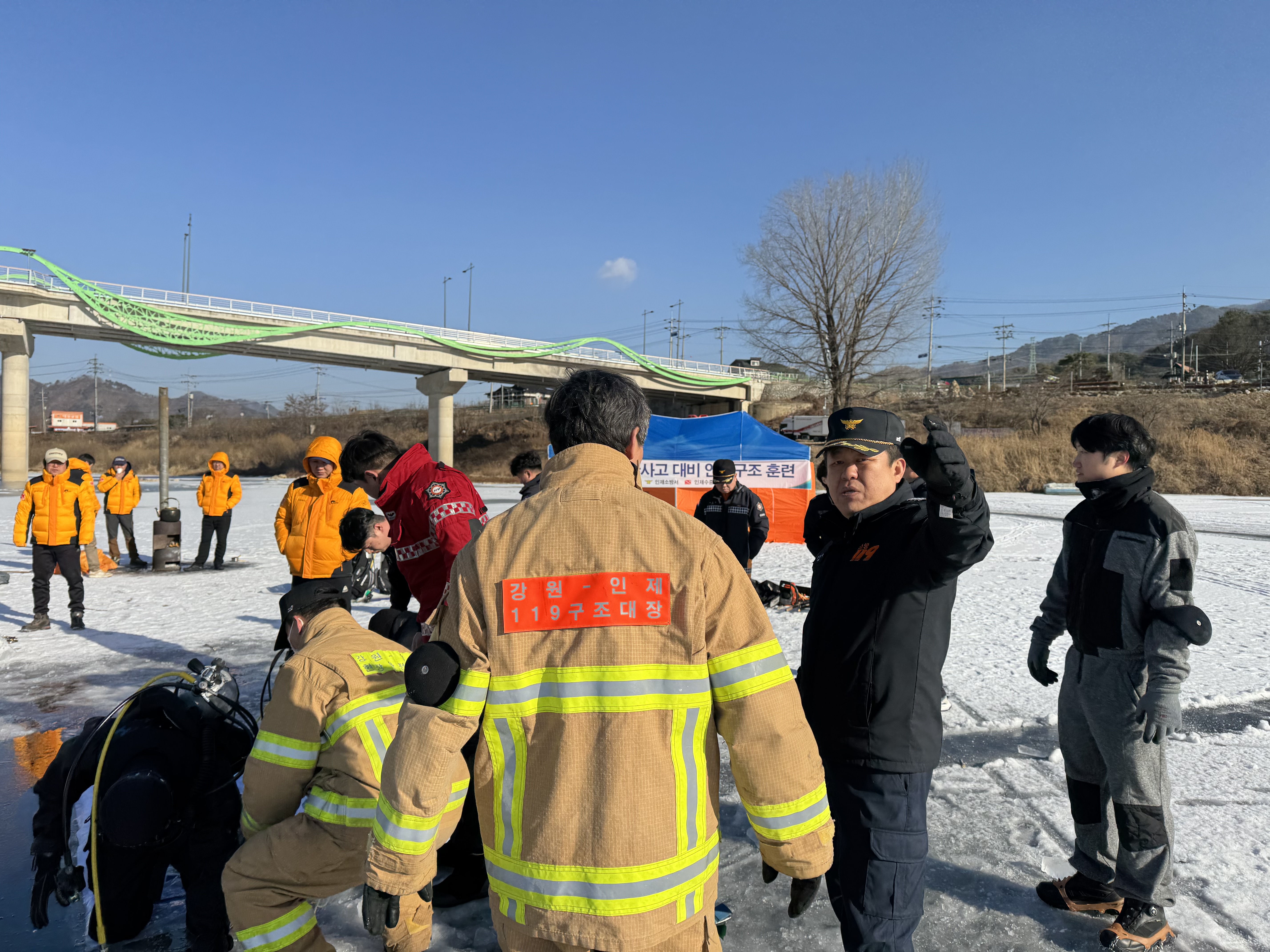 인제소방서는 금일 인제읍 덕산리 합강교 밑 하천에서 인제군 민간수중구조대와 함께 동계 수난사고 대비 합동훈련을 실시하였습니다.