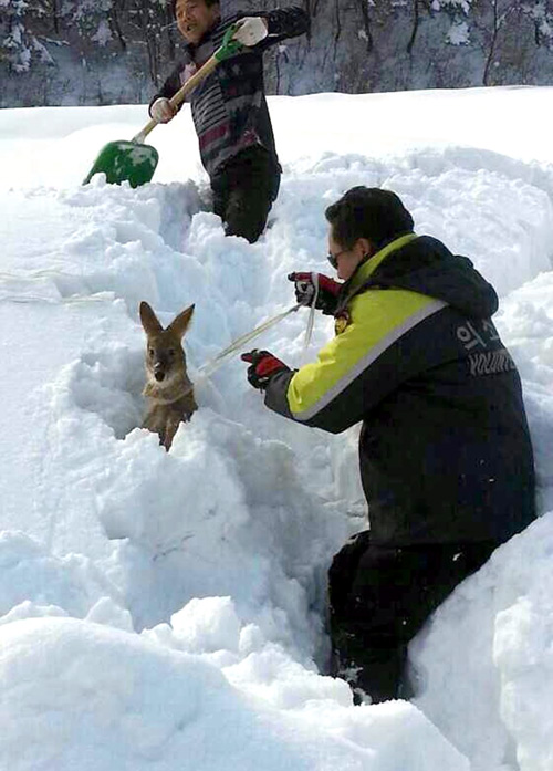 인제소방서(서장 김용락) 소방공무원과 의용소방대원 30여명은 13일 고성군 산간 도로와 간성읍 비닐하우스 제설을 지원했다. 특히 이날 폭설로 먹이를 구하지 못해 마을에 내려왔다가 2m깊이 농수로에 고립돼 있는 고라니를 발견해 로프를 이용해 구조하기도 했다.