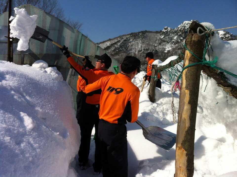 2014년 2월 15일 인제소방서(서장:김용락) 공무원과 의용소방대 60여명이 폭설로 뒤덮인 고성군 간성읍 탑동마을에서 제설․ 복구작업을 하고 있다.