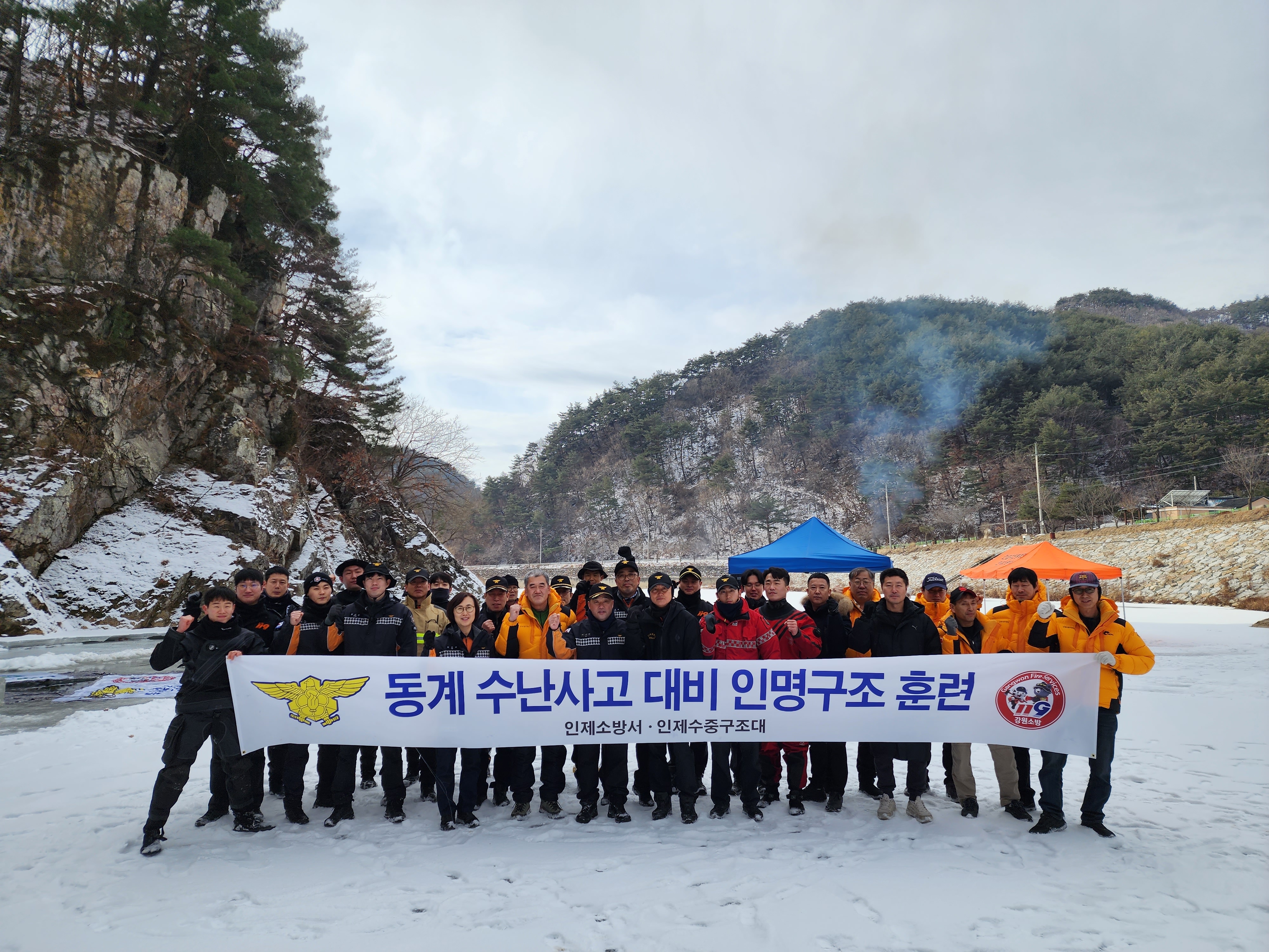 인제소방서(서장 김정희)는 17일 수요일, 인제군 가아리 마라톤 펜션 앞 하천에서 동계 수난사고 대비 합동 인명구조훈련을 진행했다고 전했다.