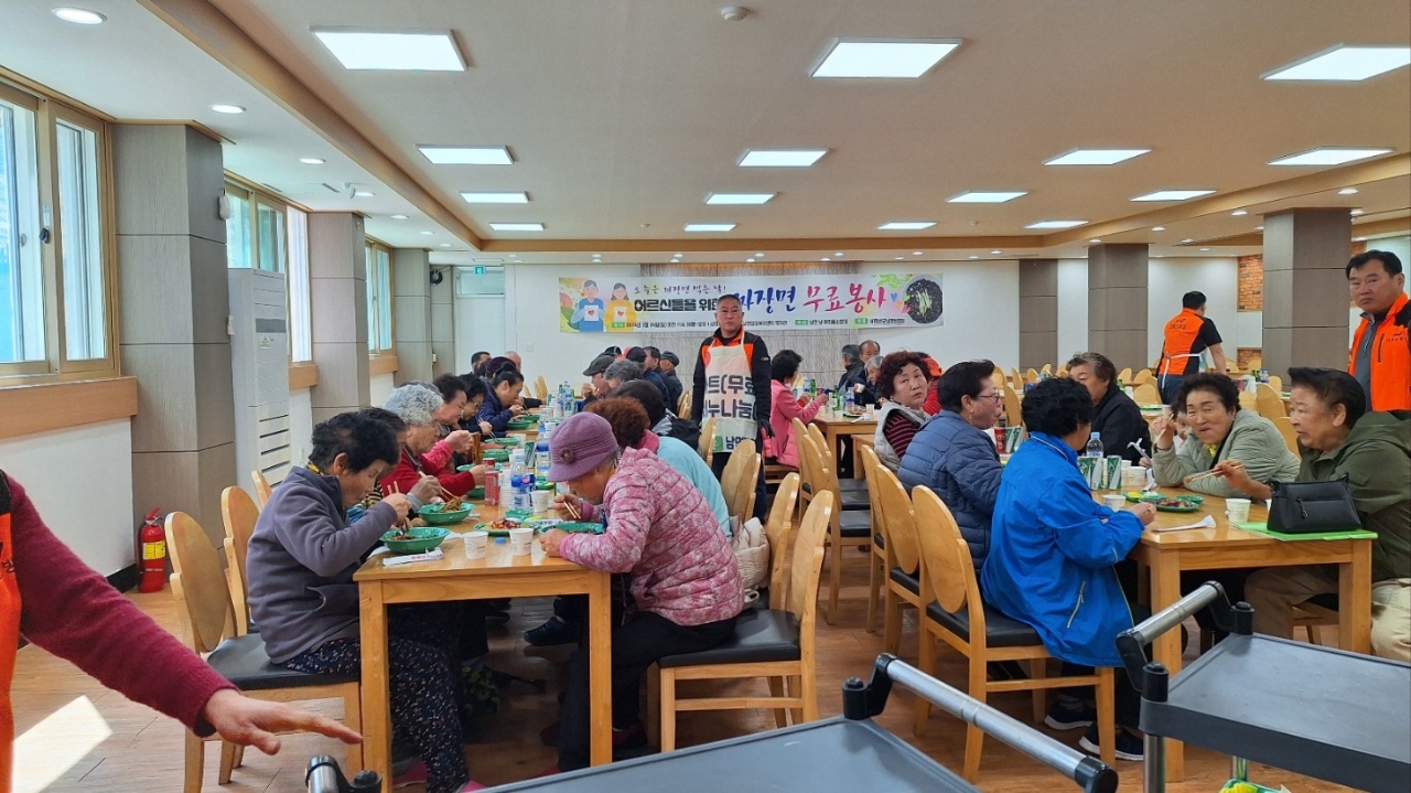 ➤ 이날 봉사활동에는 남면남·여의용소방대 대원 20명이 준비하여 남면에 거주하시는 어르신 100여명을 모시고 환절기 입맛을 돋구는 짜장면 봉사활동을 실시했다.