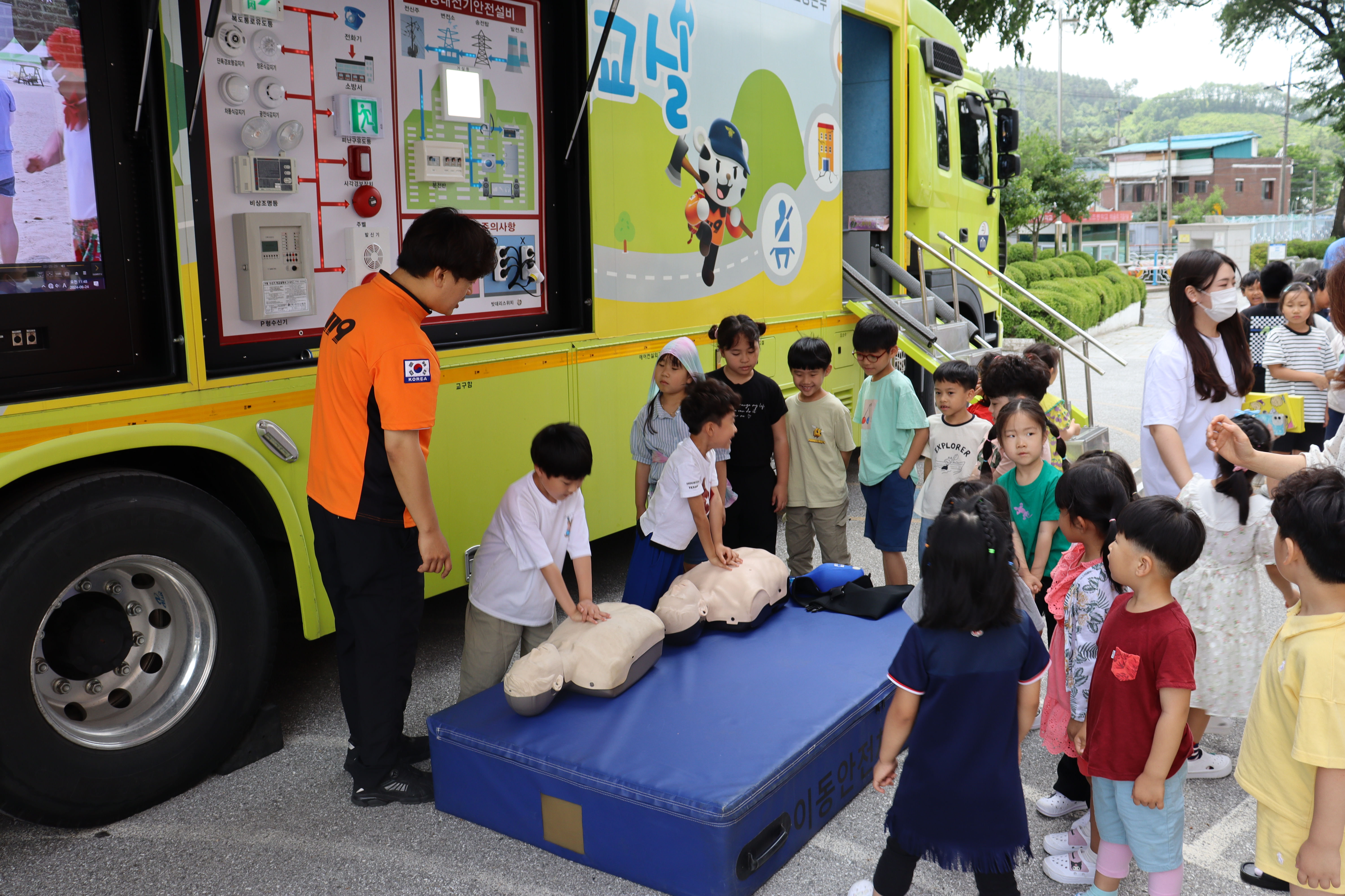 ➤ 이날 행사는 각종 재난에 대처하는 체험 위주의 교육으로 구성됐다. 주요내용은 ▲지진 발생 대처 요령 ▲상황에 따른 화재 피난행동요령 ‘불나면 살펴서 대피’ 교육 ▲소화기 사용법 교육 ▲이동안전체험차량 교육 ▲심폐소생술 및 응급처치법 교육 등이다.