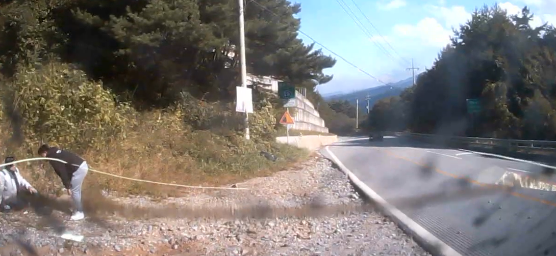 A씨의 안전확보 후 2차 사고를 예방하기 위해 개인차량에 적재되어있는 삼각대를 설치하여 후방에서 진행하는 차량에게 서행 운전을 유도했다.