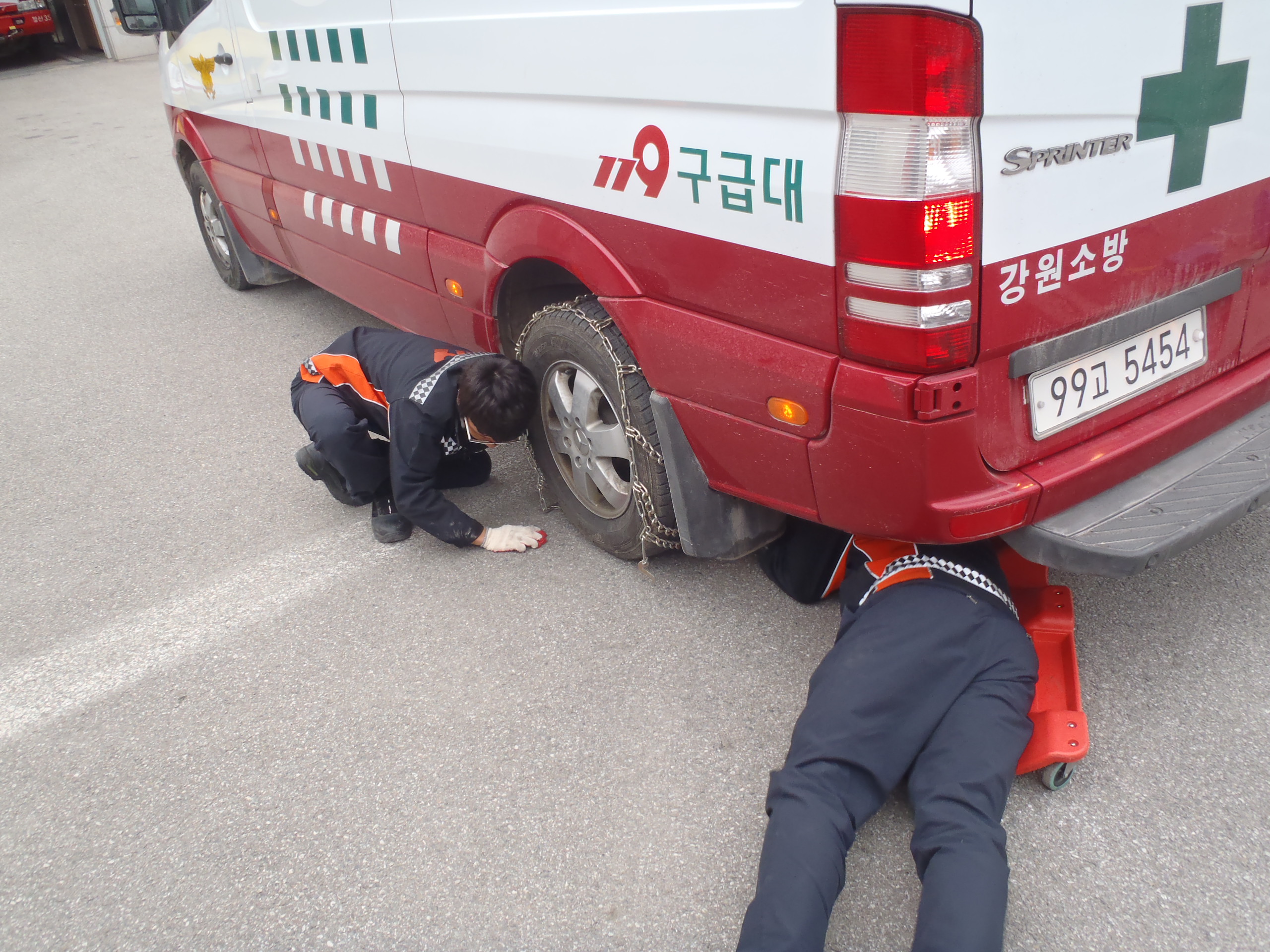 정선소방서(서장 박창진). 정선119안전센터에서는 겨울철 폭설 대비 출동 차량에 체인장착 훈련 및 월동장구 점검에 임하였습니다.