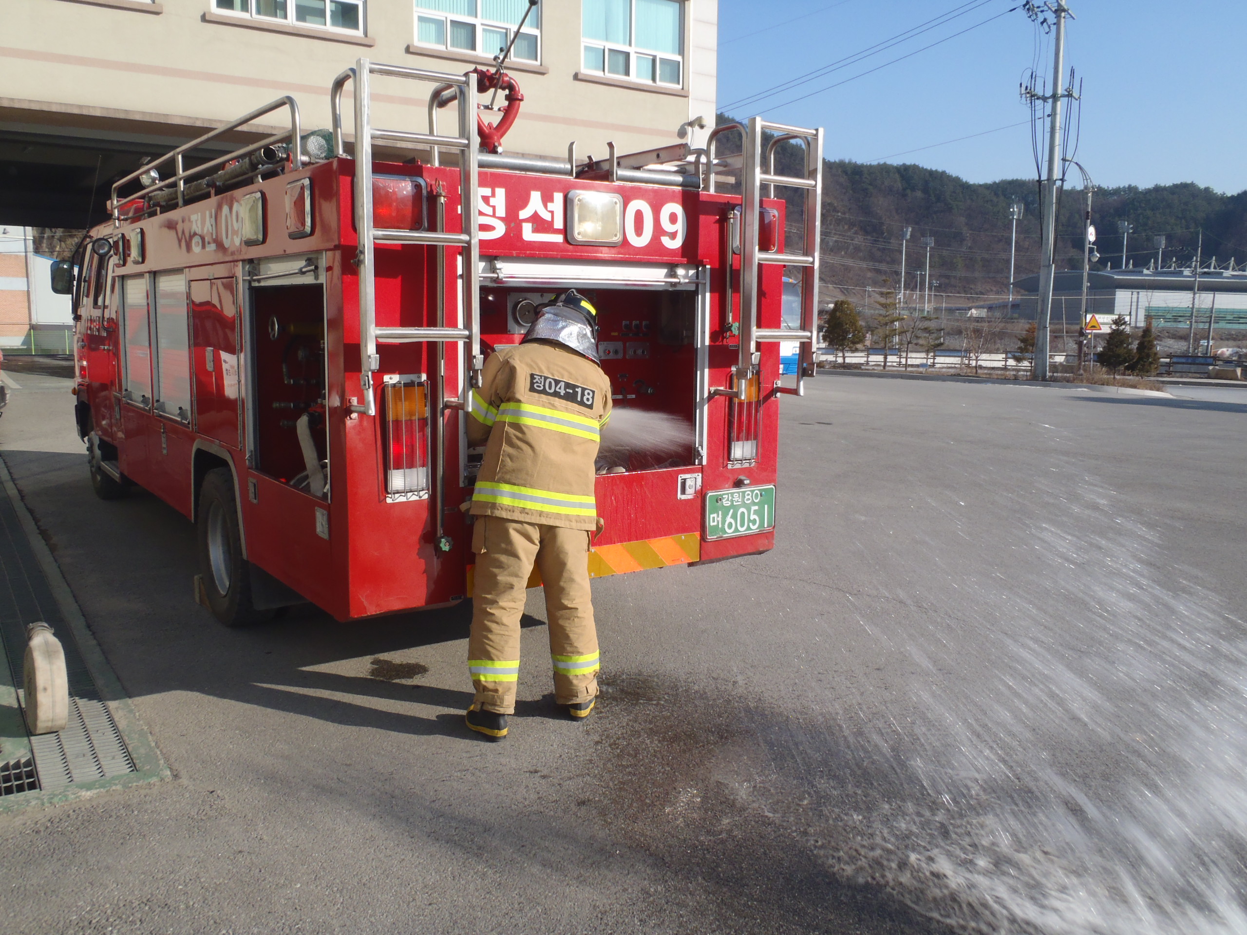 정선소방서(서장 박창진) 정선119안전센터에서는 금일 신규직원 교육을 실시하였습니다. 소방펌프차를 이용한 1인방수 훈련 및 수관 사리기,연장,회수 등의 숙달훈련을 하였습니다.