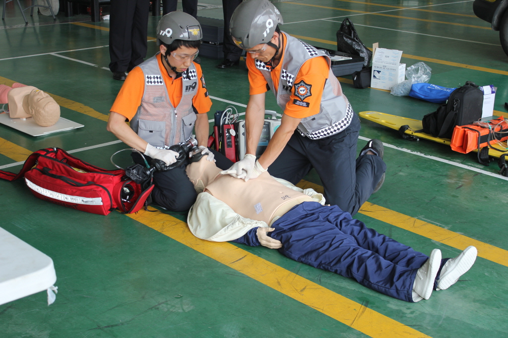 제26회 강원도 소방기술경연대회 구급분야 참가 선수단이 본서 차고에서 시연회를 펼치고있다.